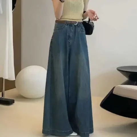 新款直筒设计大阔腿牛仔长裤女复古百搭梨形遮肉高腰宽松拖地裤子