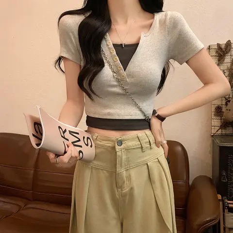 粉色正肩V领短袖T恤女夏季新款收腰显瘦假两件拼接短款甜辣小上衣