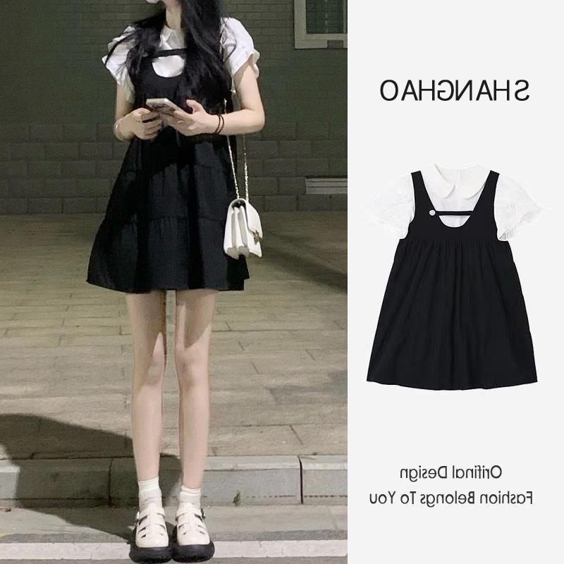 学院风假两件背带连衣裙夏季娃娃领甜美可爱减龄衬衫小个子吊带裙