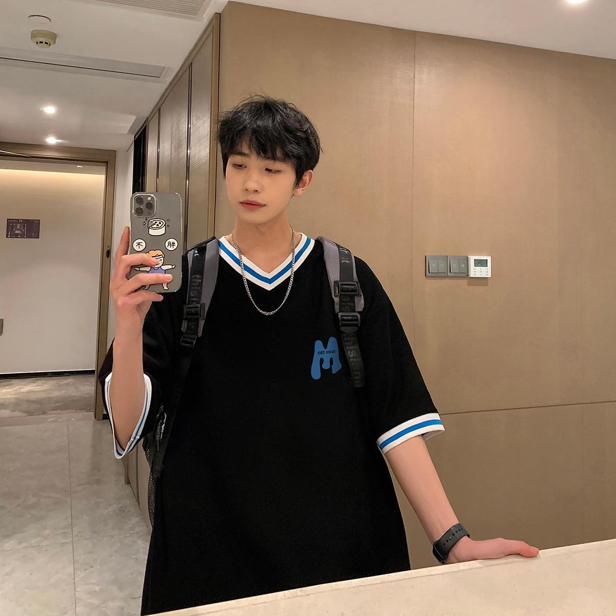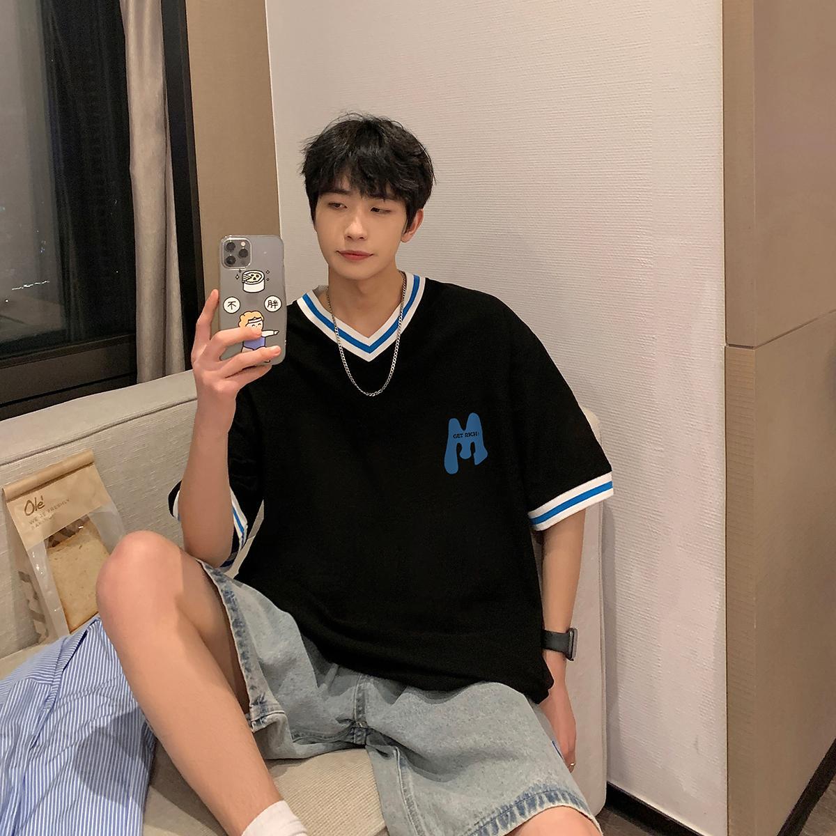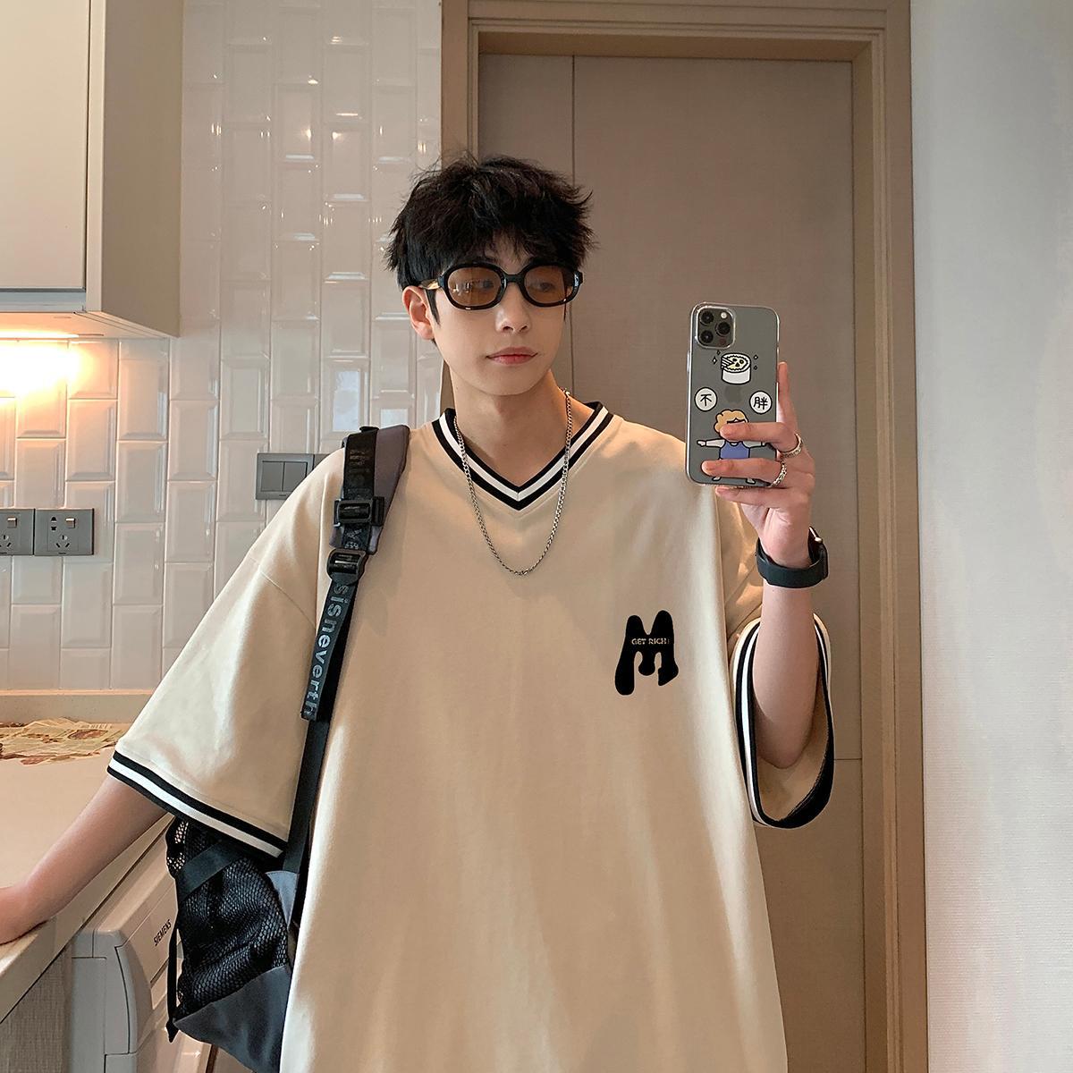V领短袖t恤男生夏季运动百搭美式复古潮流撞色宽松青少年半袖上衣
