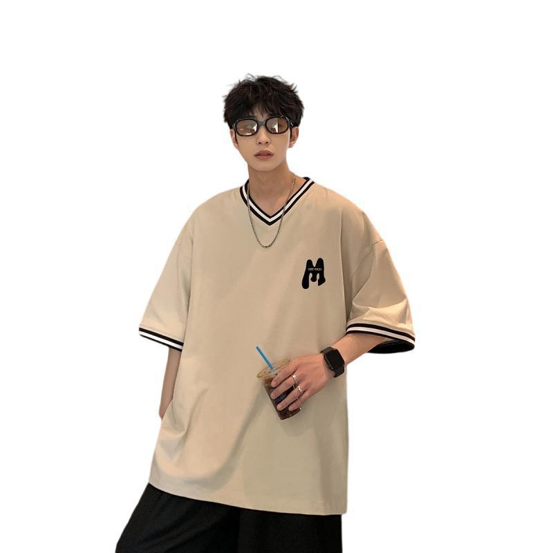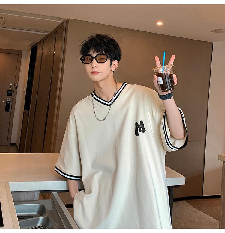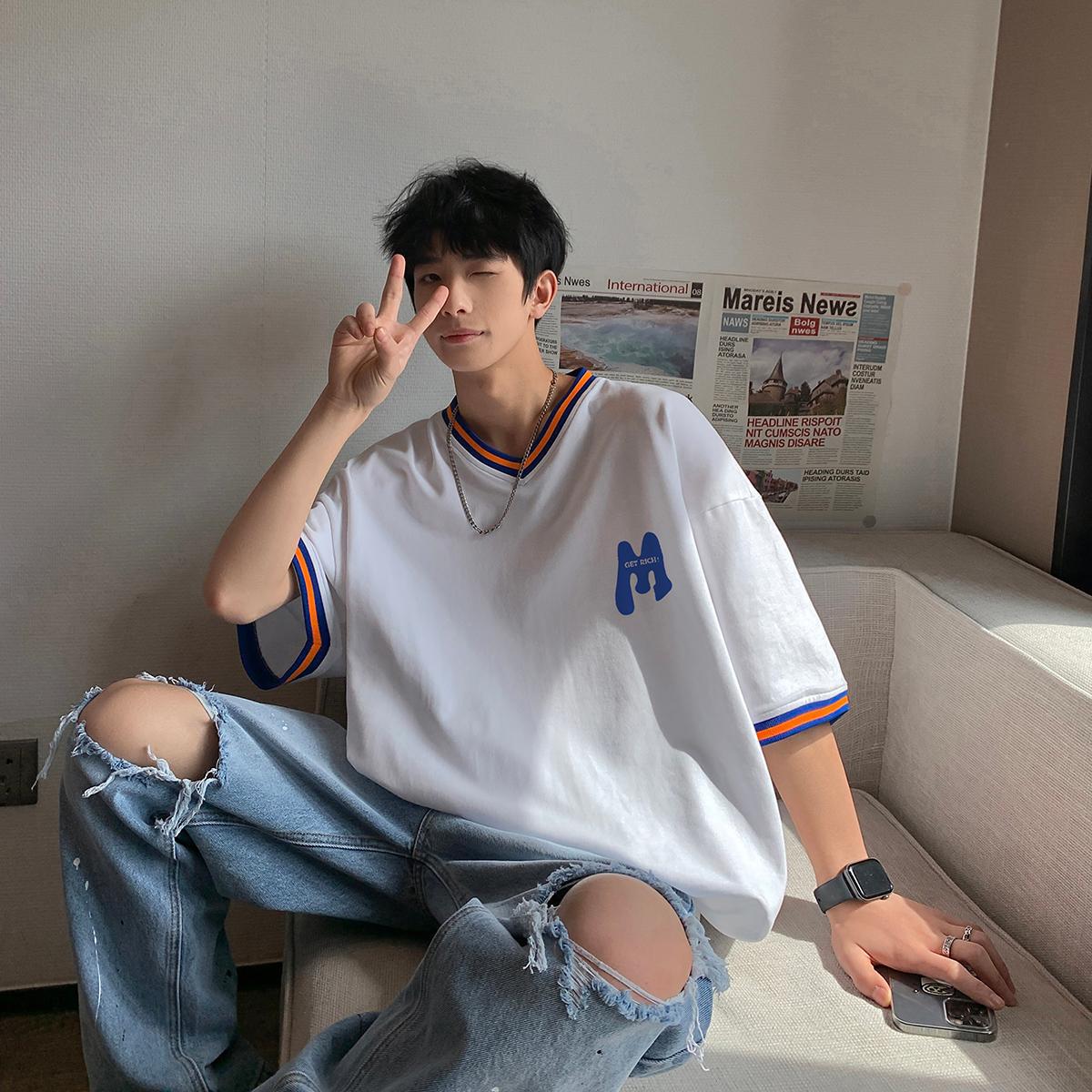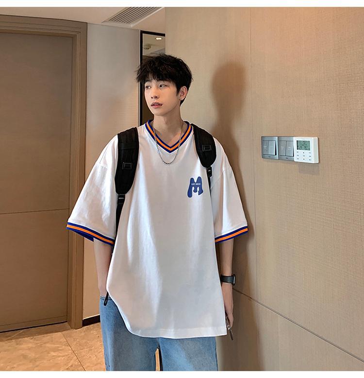V领短袖t恤男生夏季运动百搭美式复古潮流撞色宽松青少年半袖上衣