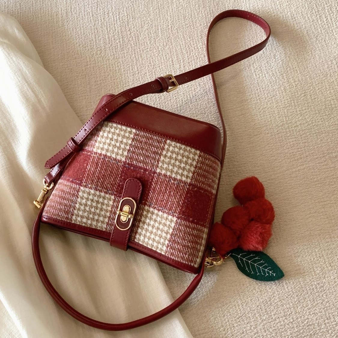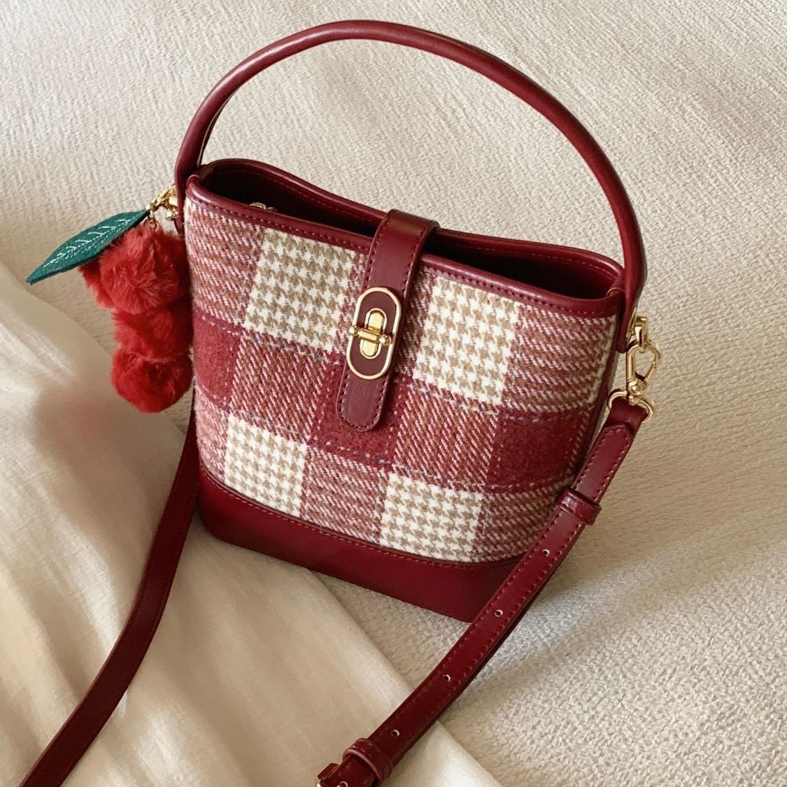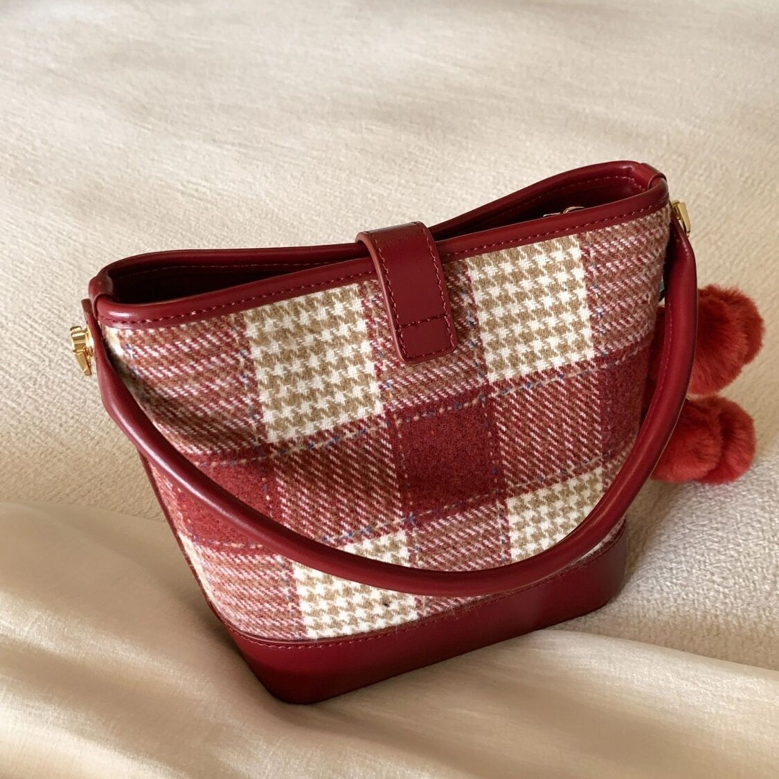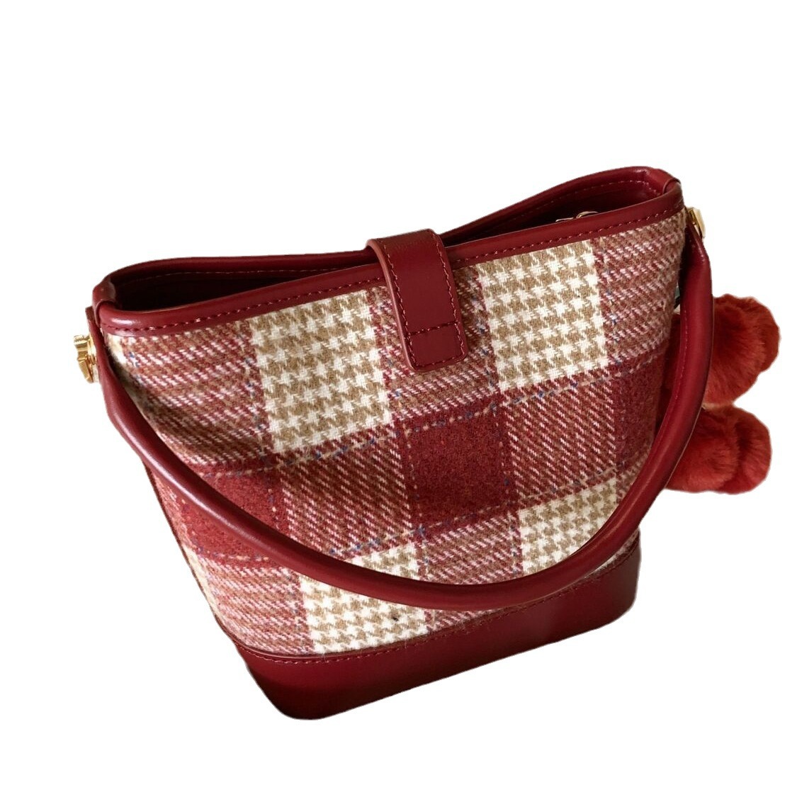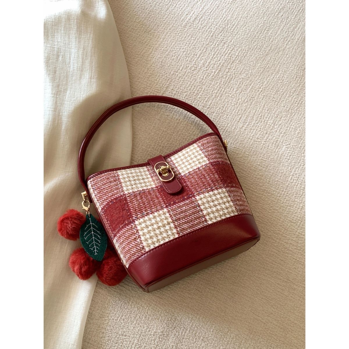 红色格子迷你水桶包包女高级感呢子手提包新款休闲单肩斜挎包