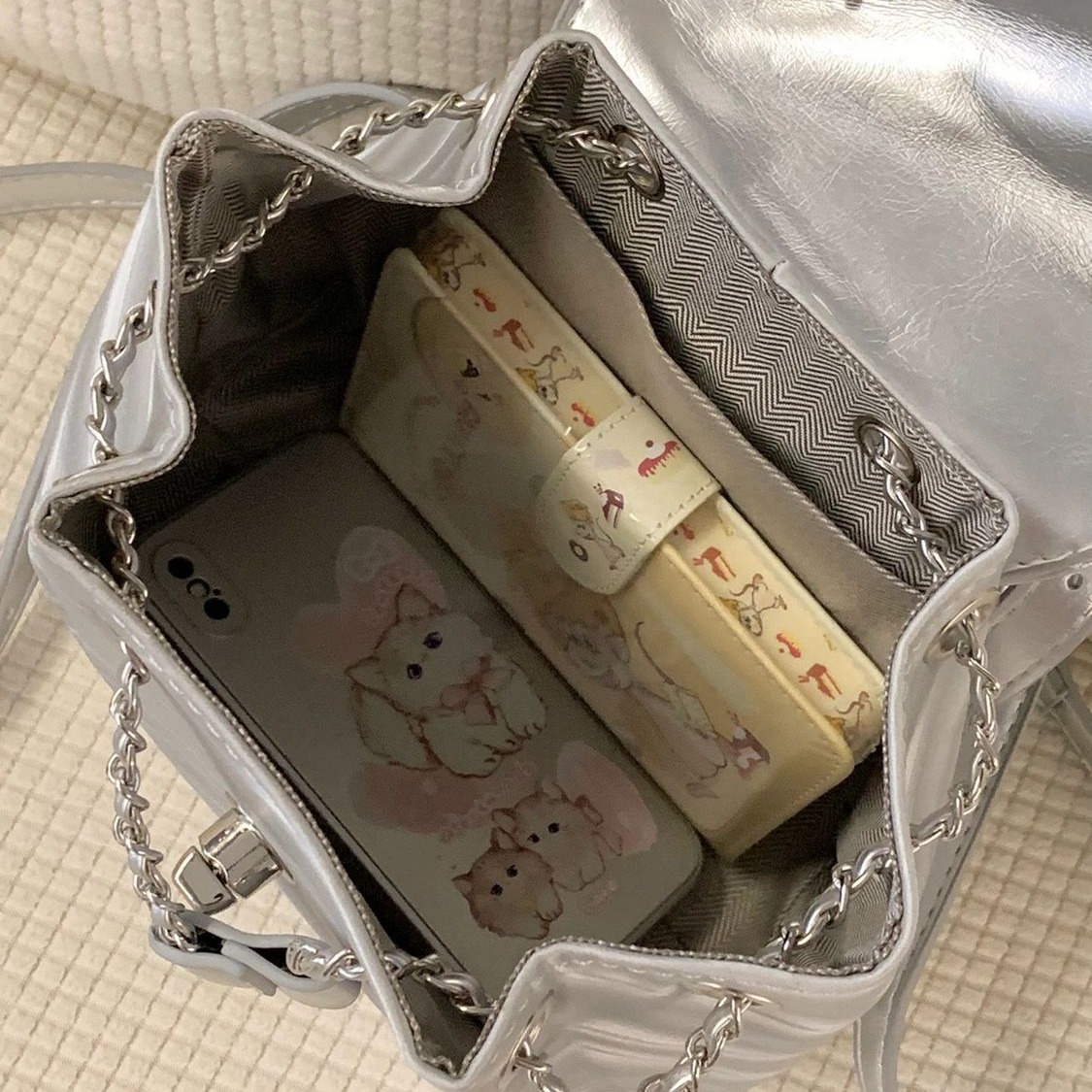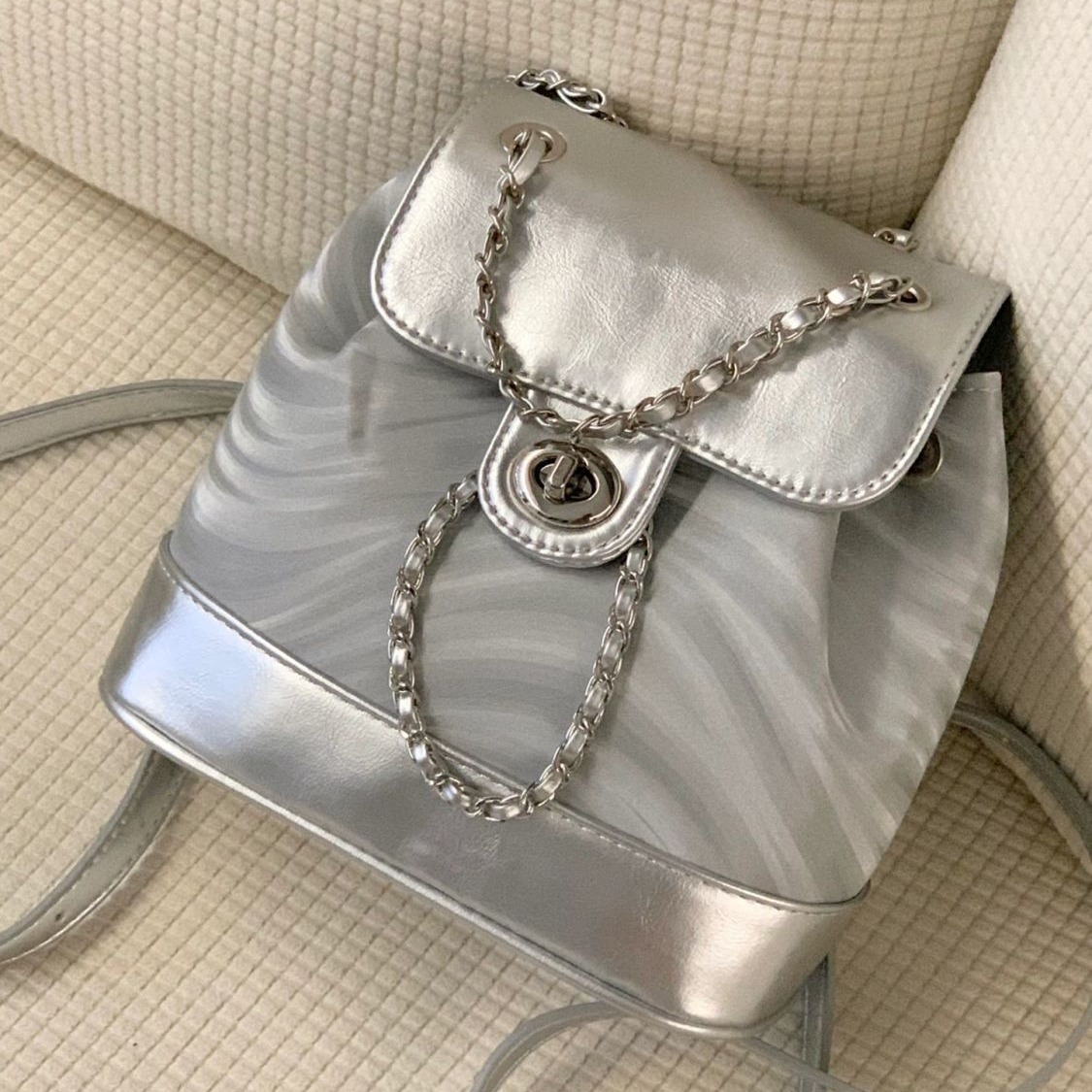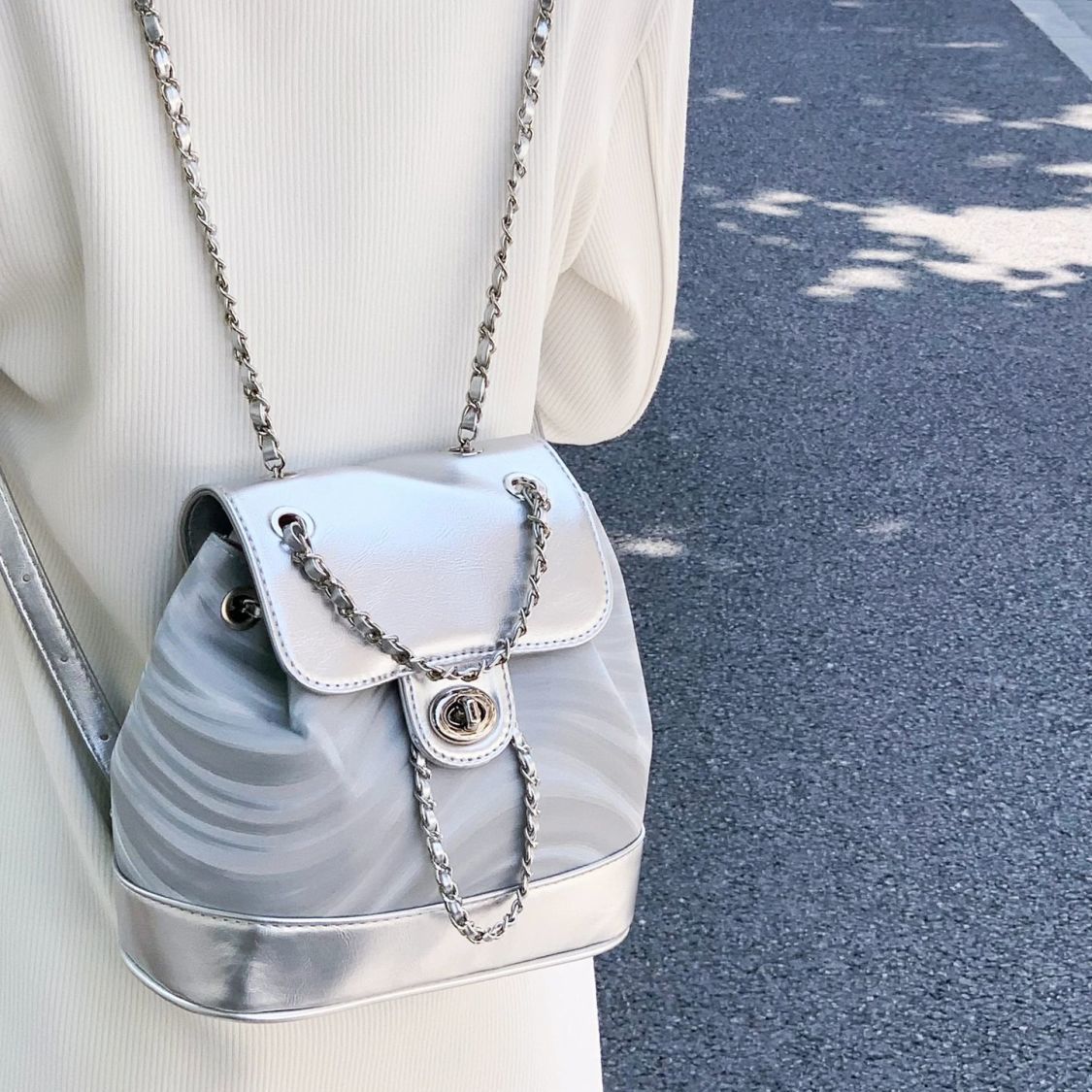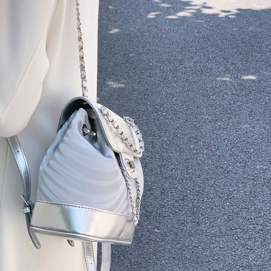 原创银色水波纹双肩包韩国小众设计百搭链条水桶包休闲手提包