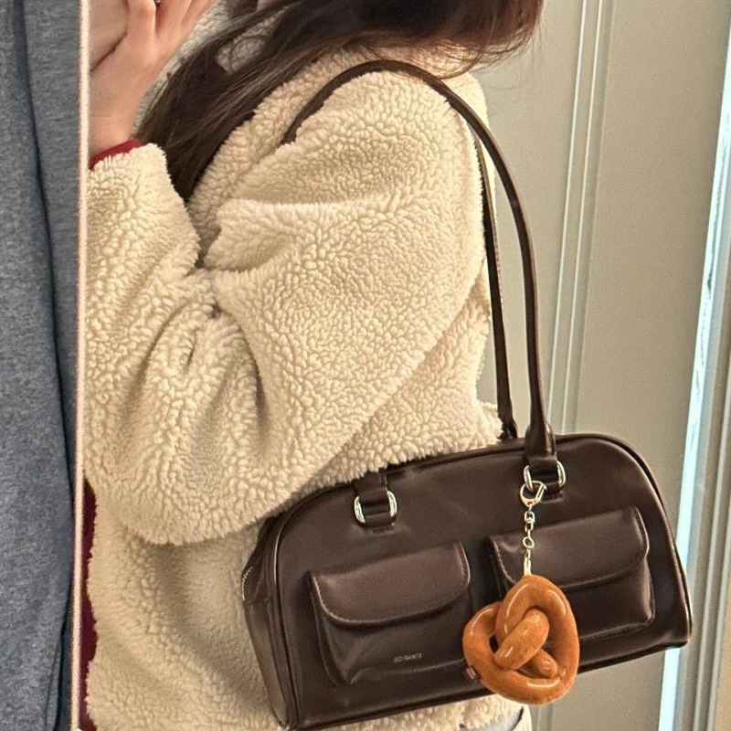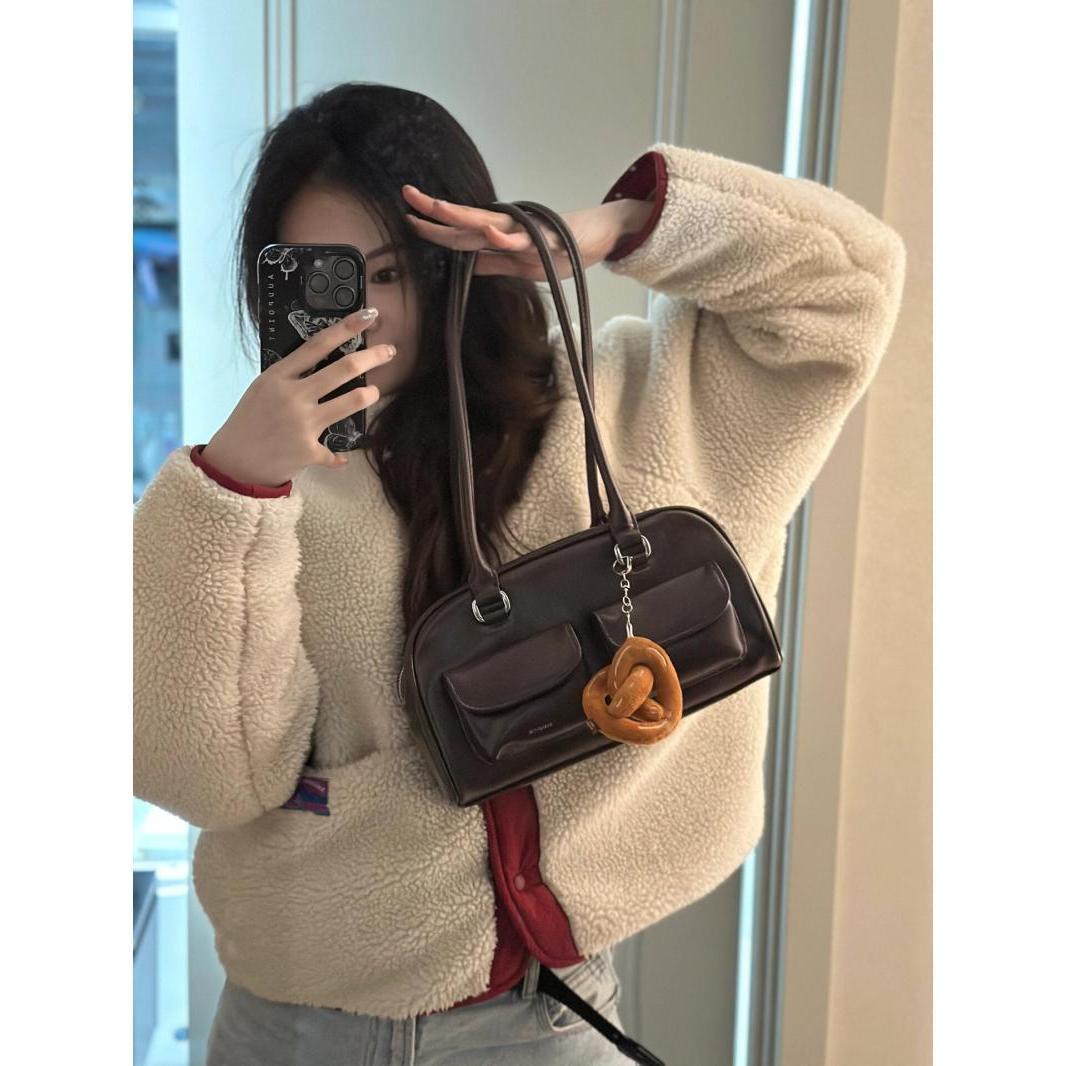 韩国小众多口袋保龄球包包女新款复古油蜡皮通勤手提单肩包