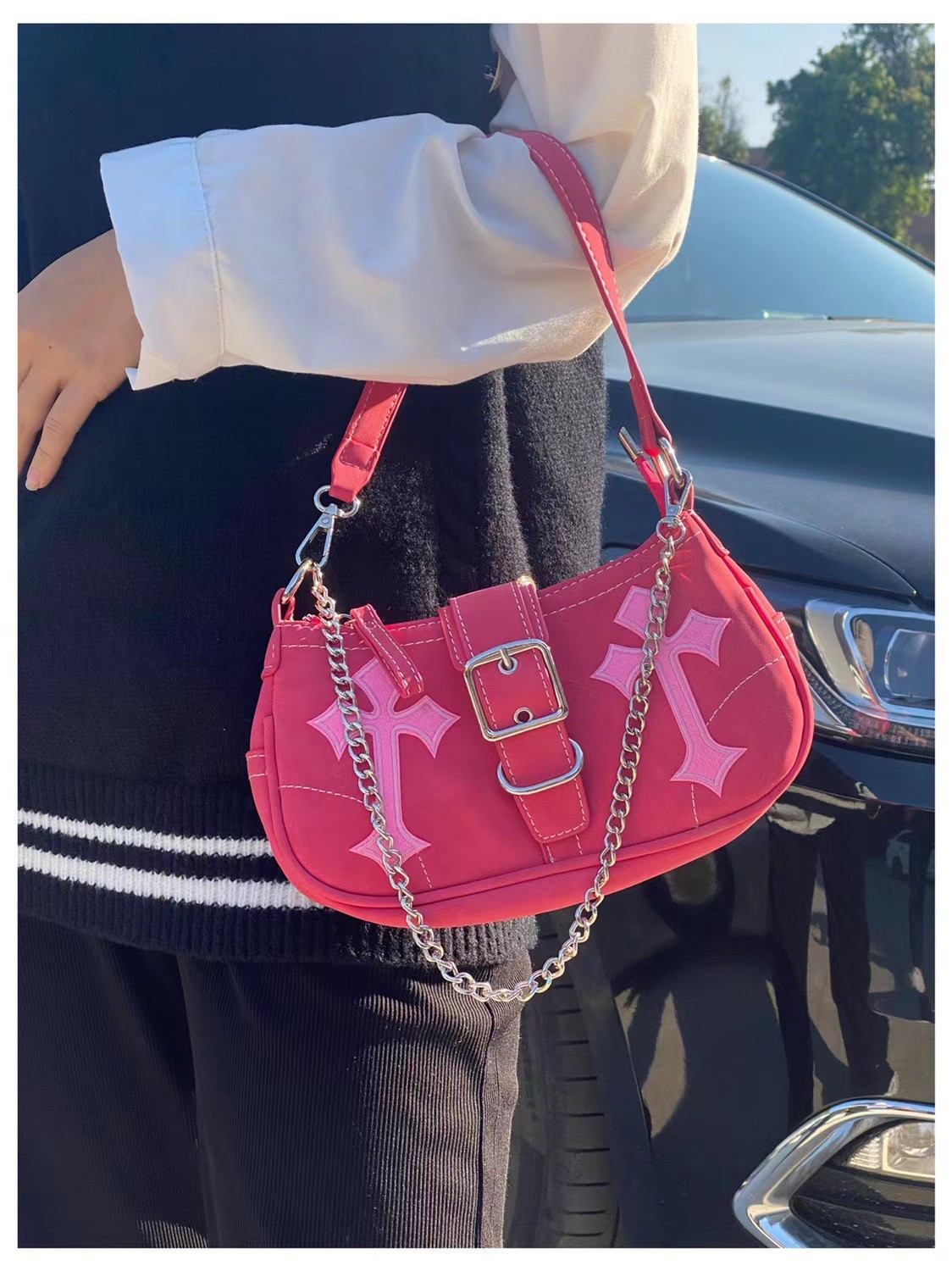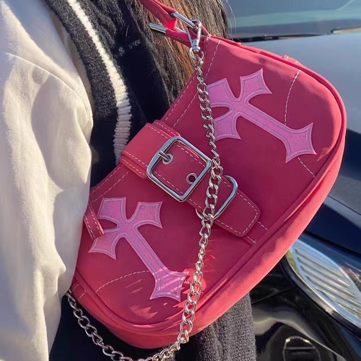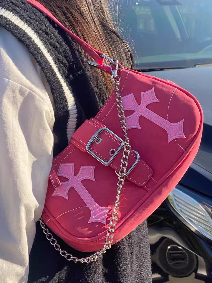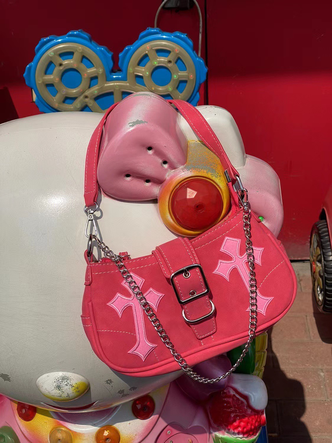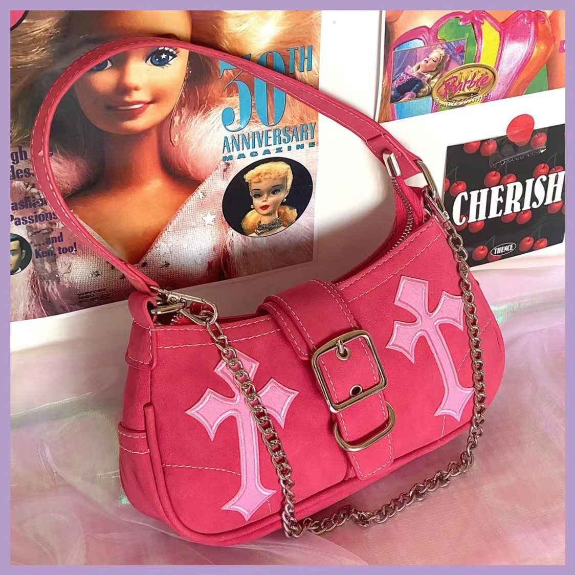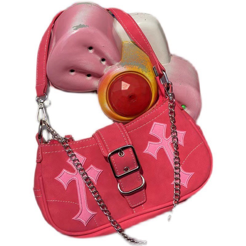 原创十字架铁链y2k千嬉辣妹腋下包玫红芭比机车甜辣斜挎包