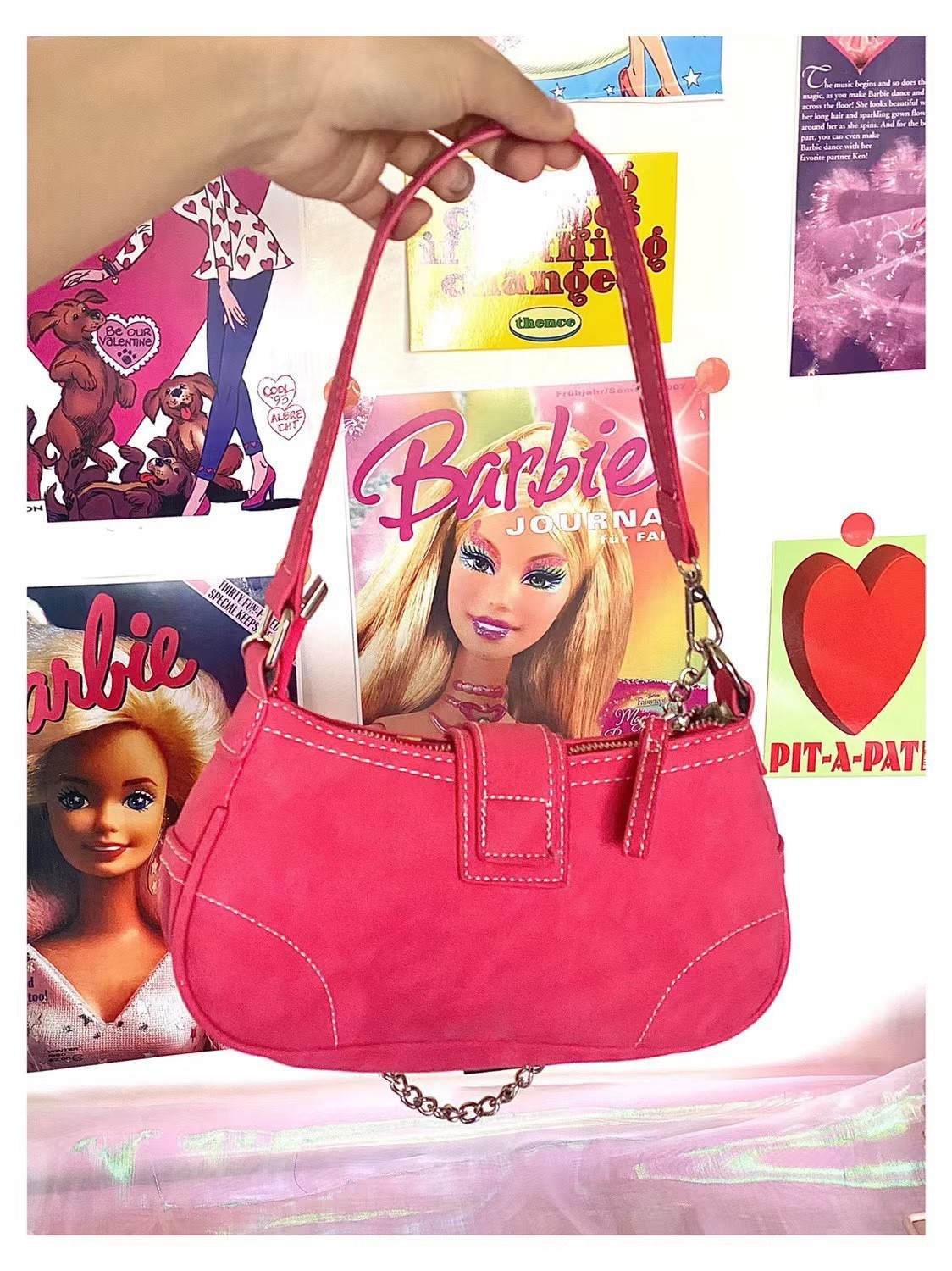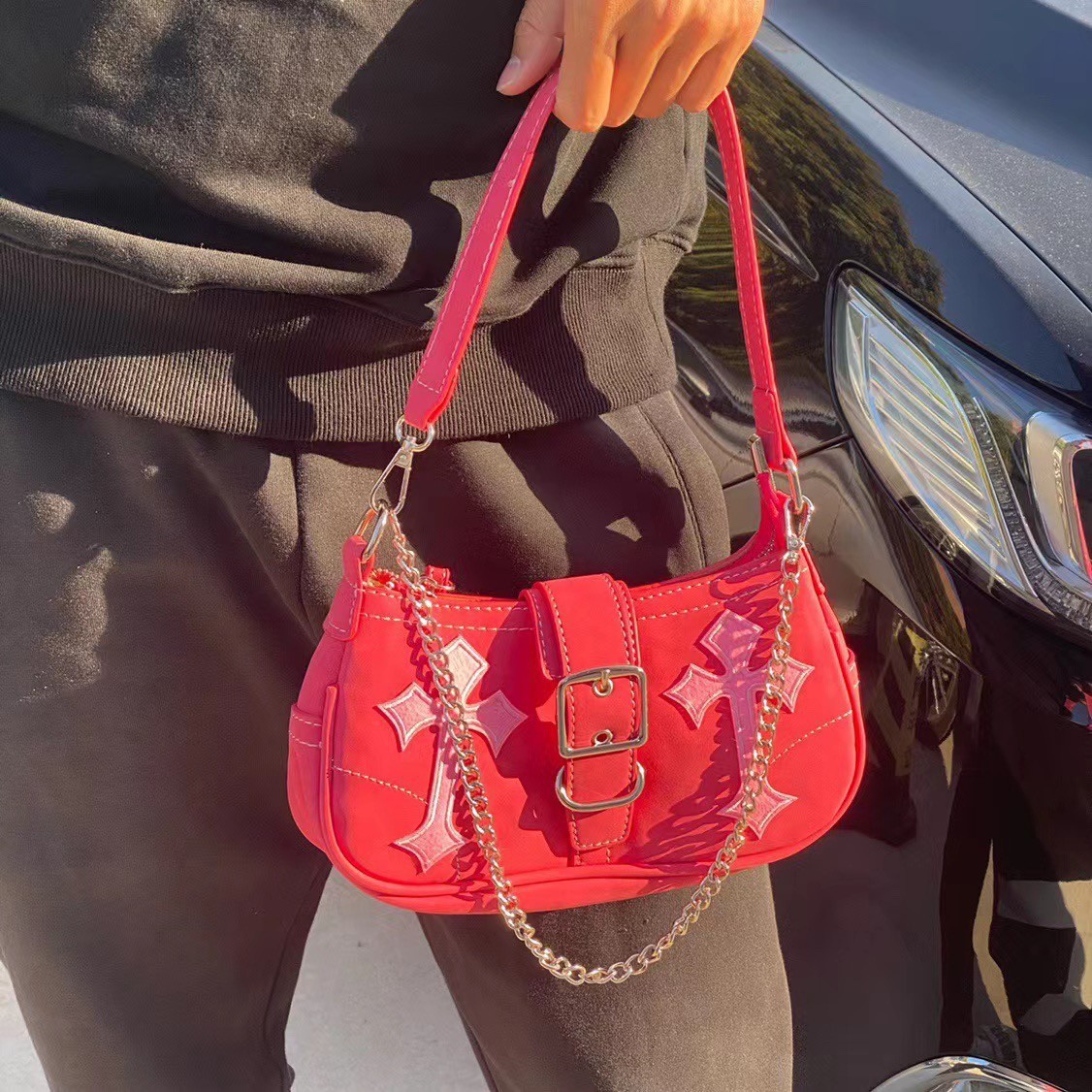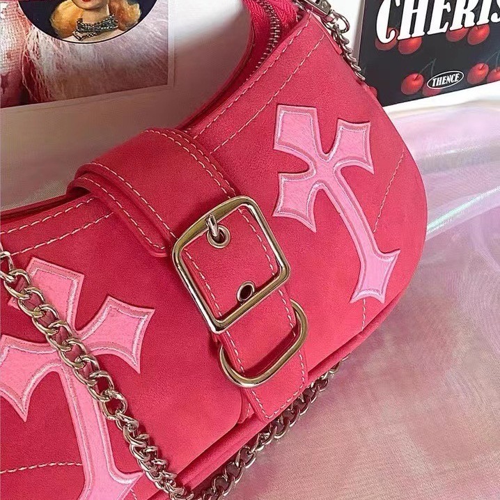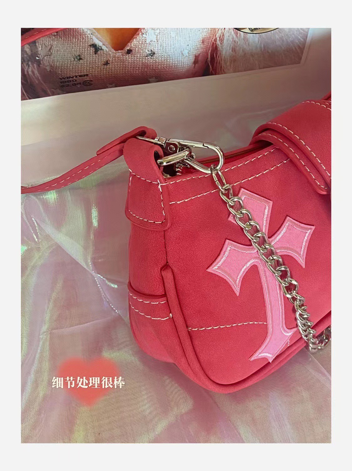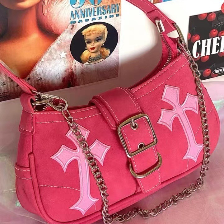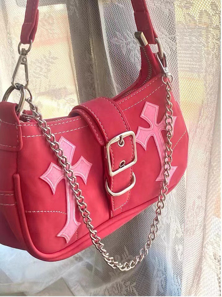 原创十字架铁链y2k千嬉辣妹腋下包玫红芭比机车甜辣斜挎包