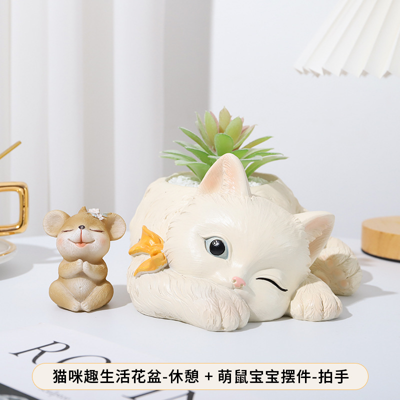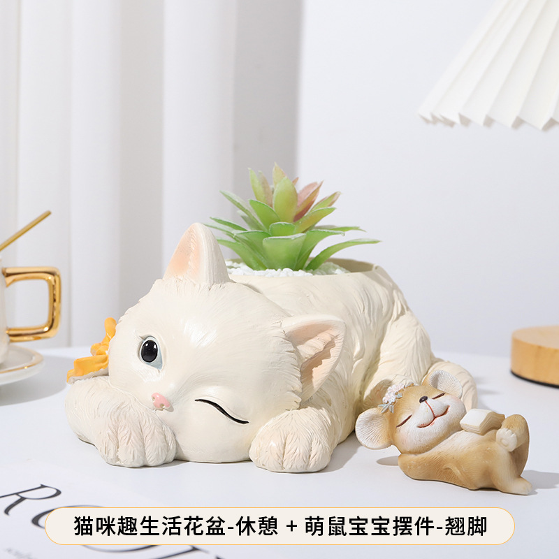 猫咪趣生活花盆-休憩+萌鼠宝宝摆件-劈腿