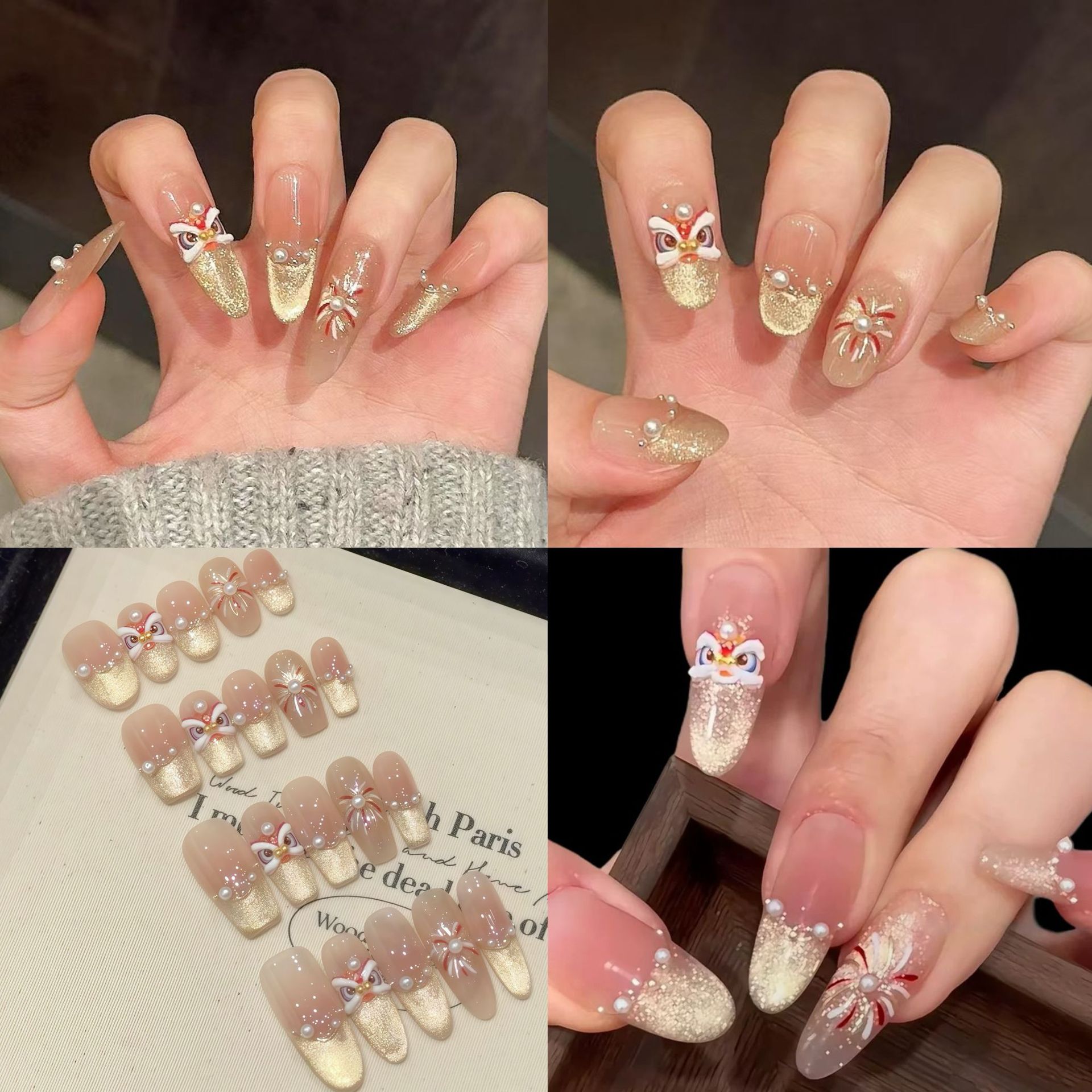 【艺禾发财醒狮】纯手工穿戴甲猫眼烟花氛围高级显白珍珠少女美甲