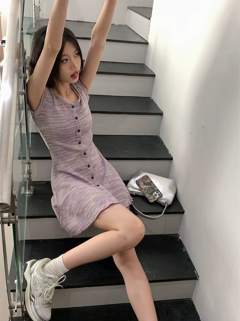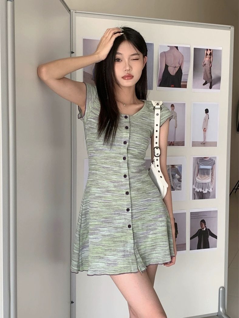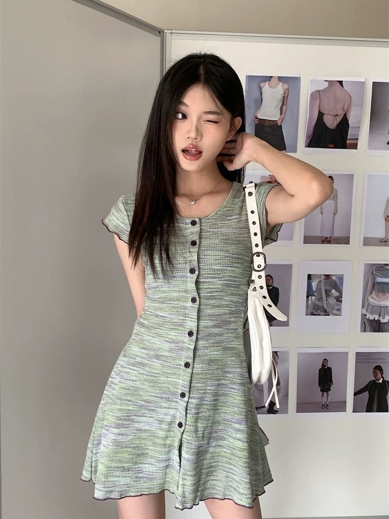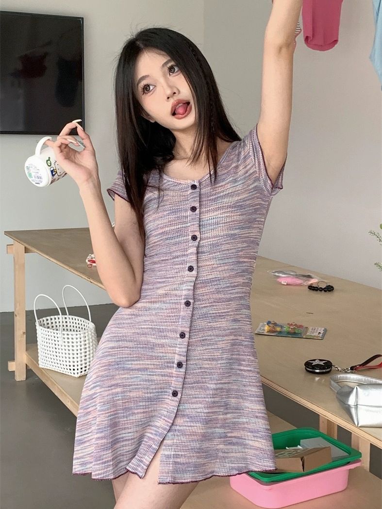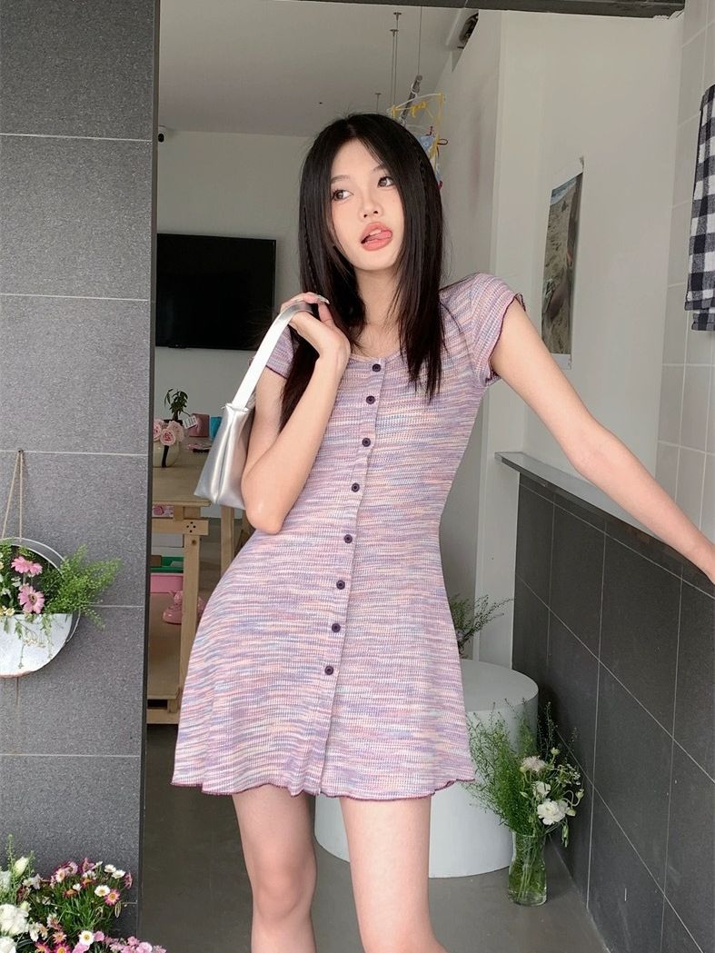 夏季新款法式条纹连衣裙女复古收腰显瘦修身针织单排多扣短袖裙子