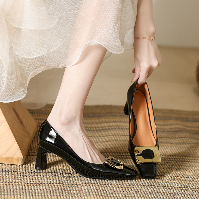 小方头时尚高跟鞋女春季新款漆皮单鞋金属方扣浅口通勤女鞋