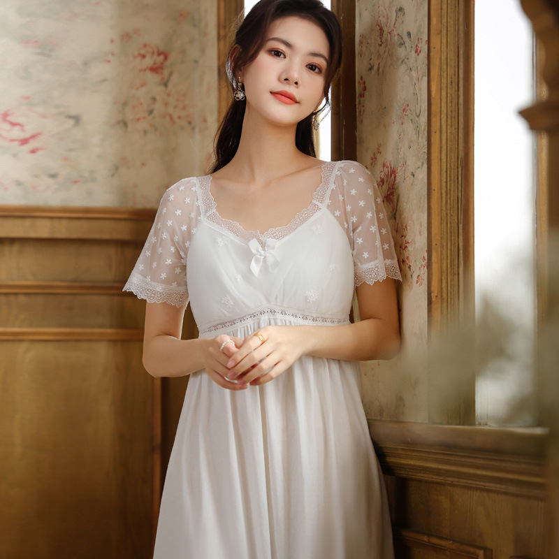 短袖睡裙女夏季棉宫廷风蕾丝公主睡衣柔软舒适带胸垫可外穿家居服