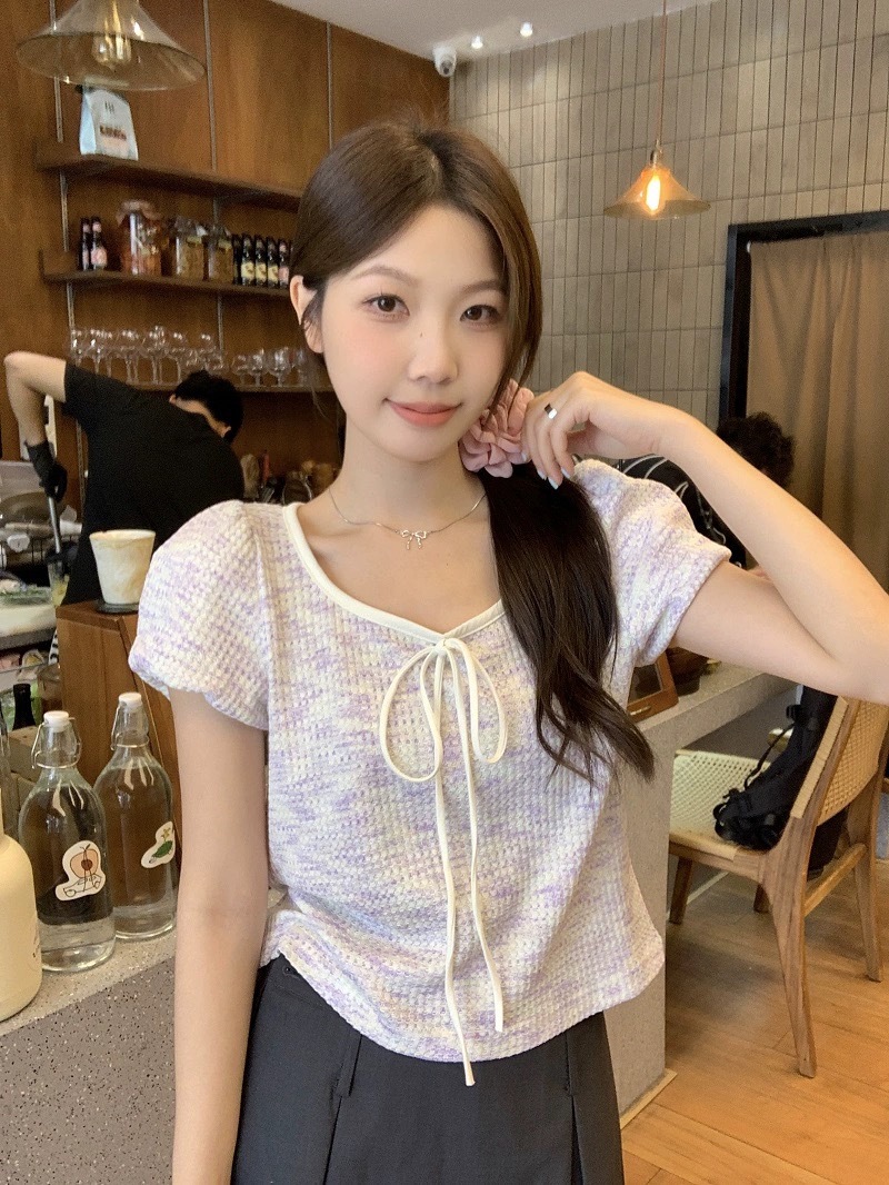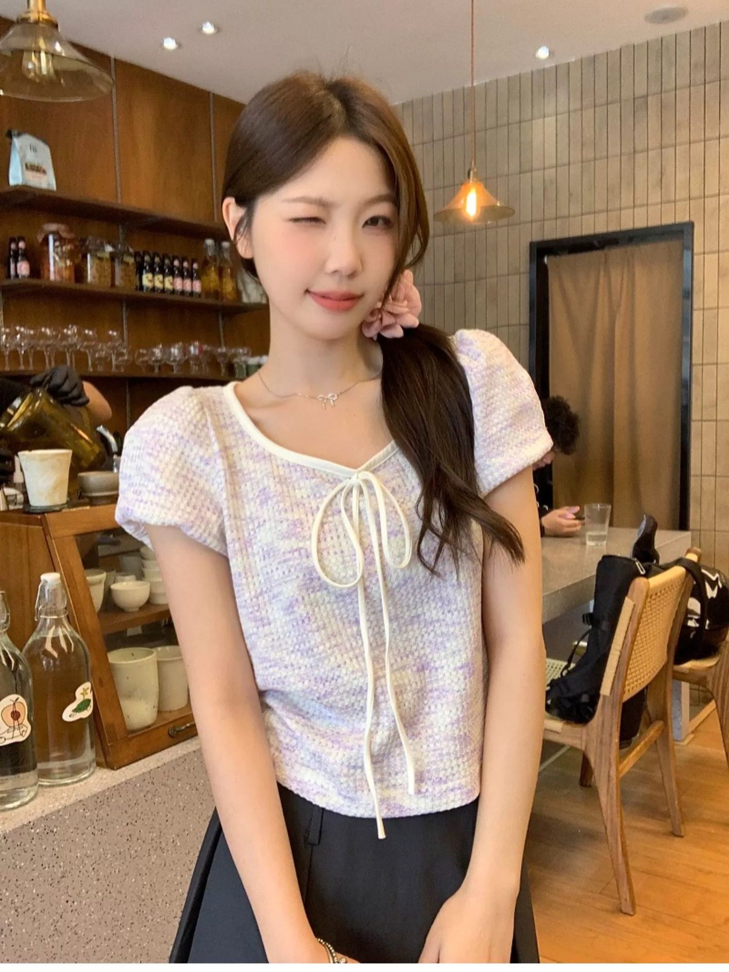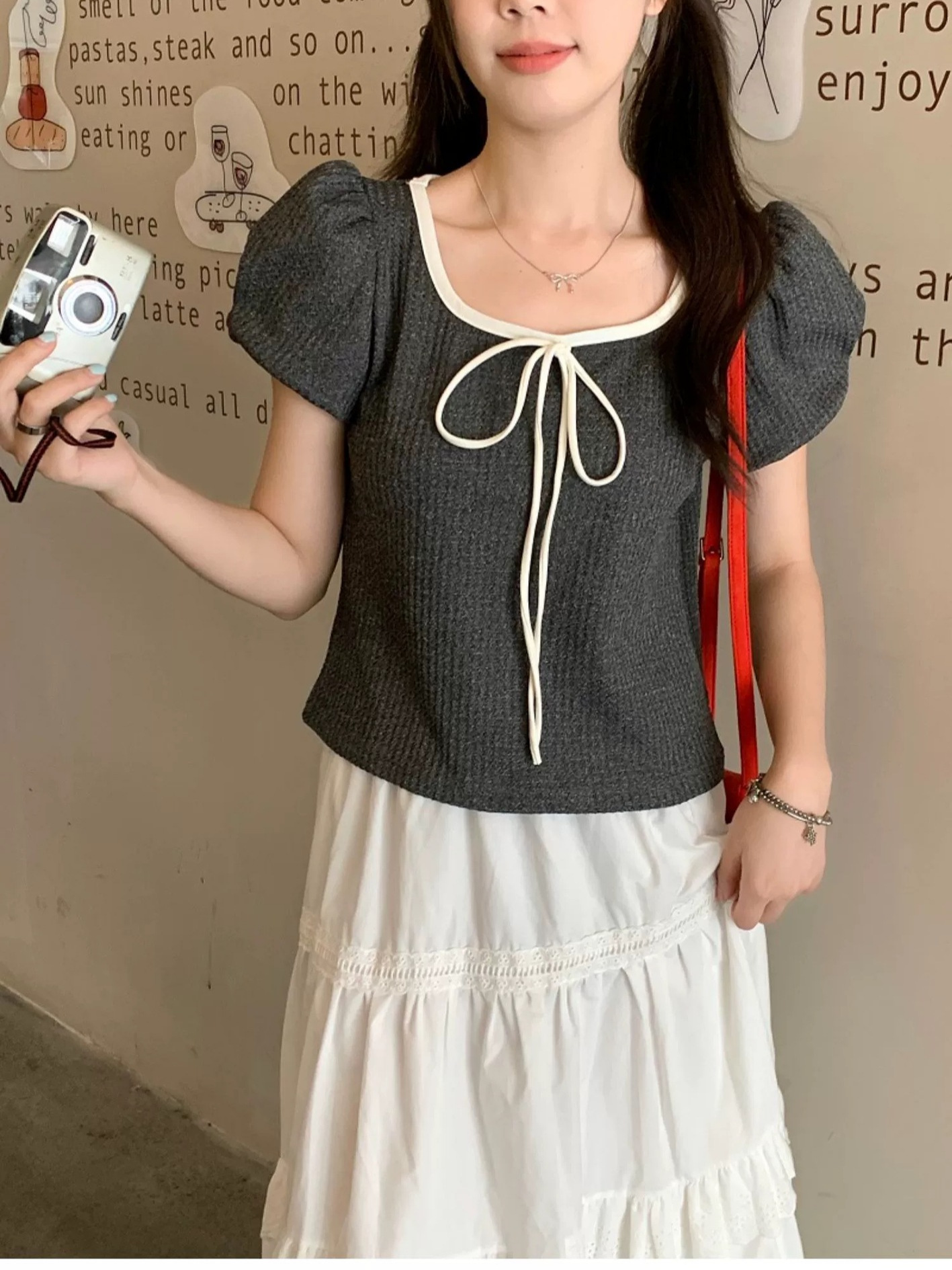 撞色领蝴蝶结短袖恤夏季甜美泡泡袖拼接小个子短款正肩短袖女上衣