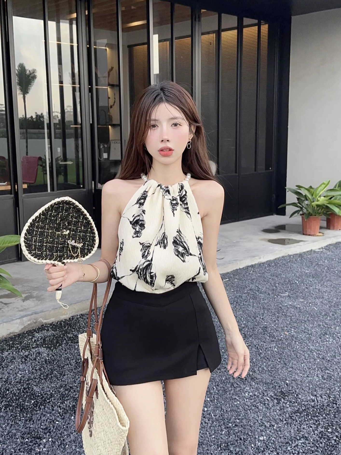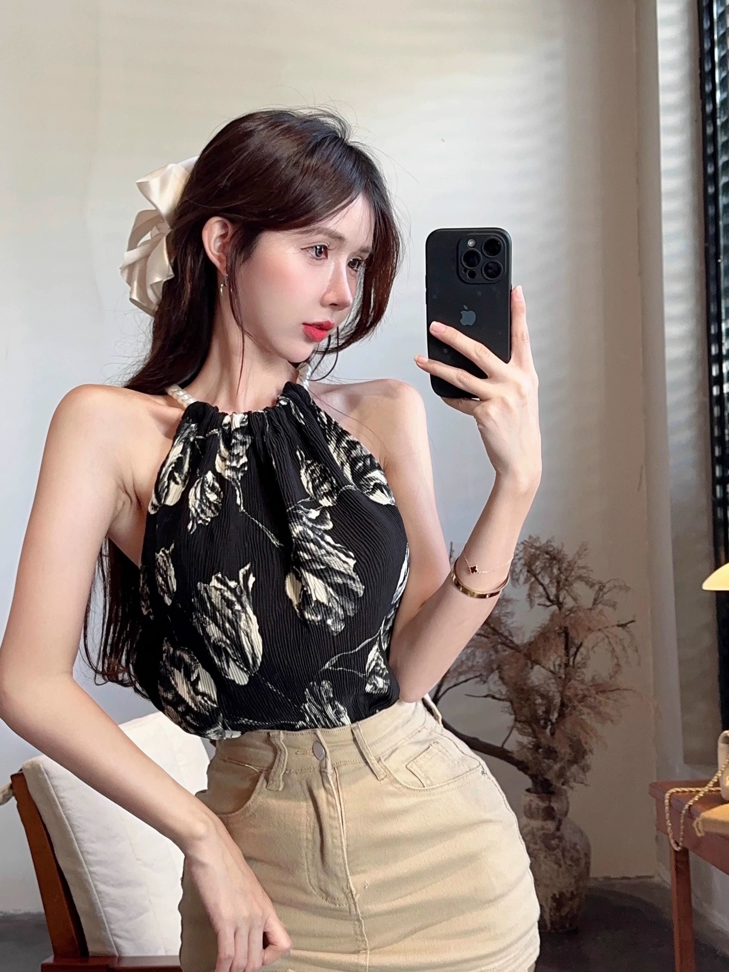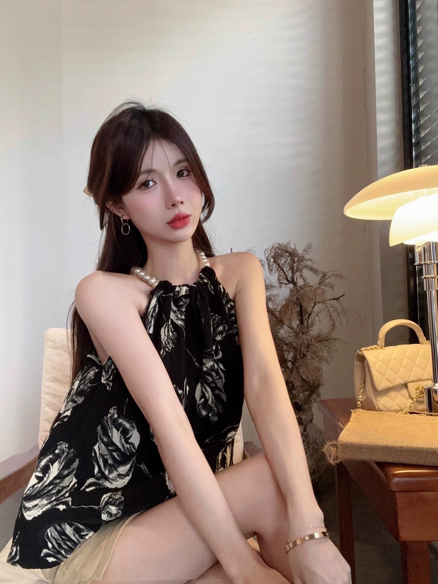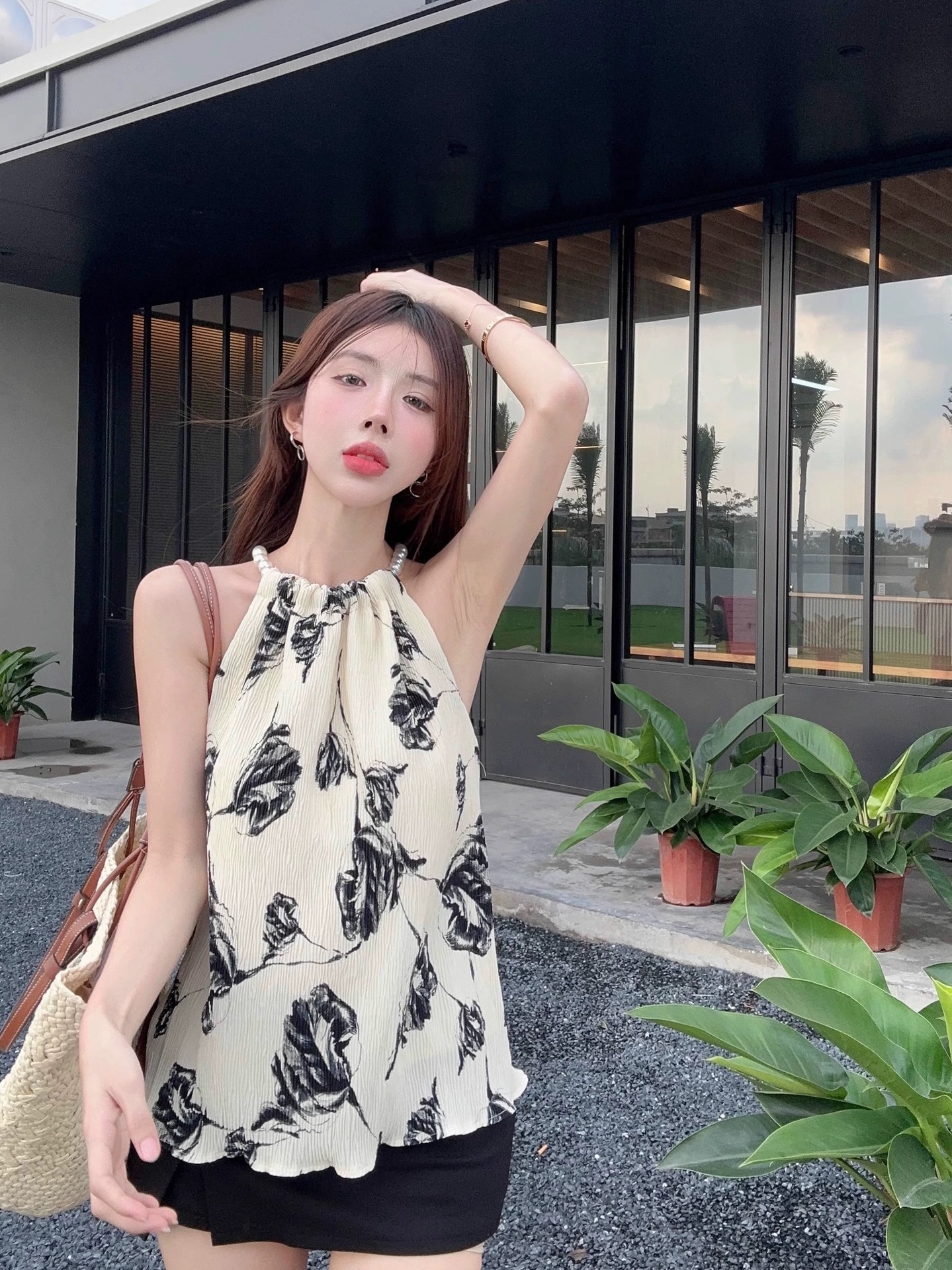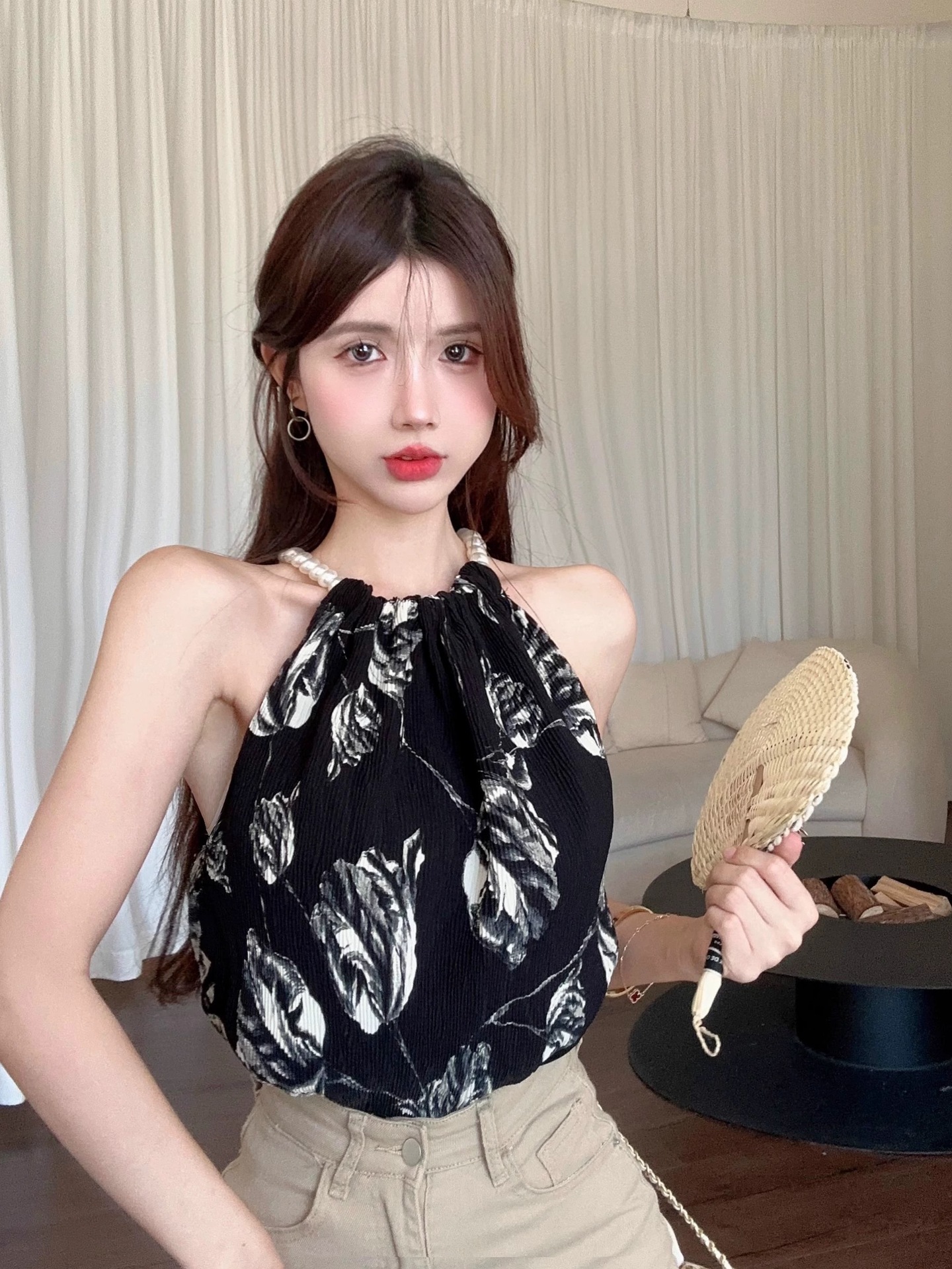 珠链挂脖款无袖吊带背心女夏季新款褶皱宽松花朵套头显瘦上衣女装