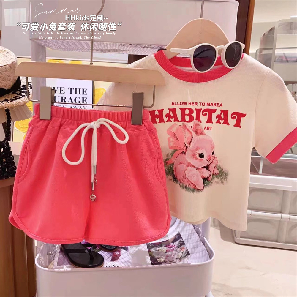 新品女童撞色包边卡通兔子印花打底衫短裤两件套2025夏装