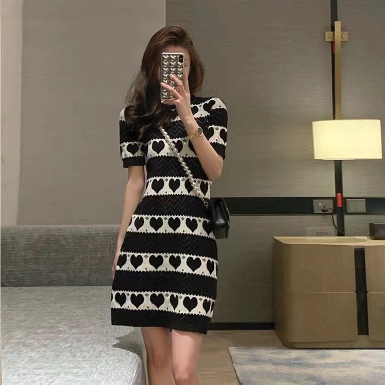 新款夏季时尚气质修身撞色心形收腰显瘦针织圆领短袖连衣裙女