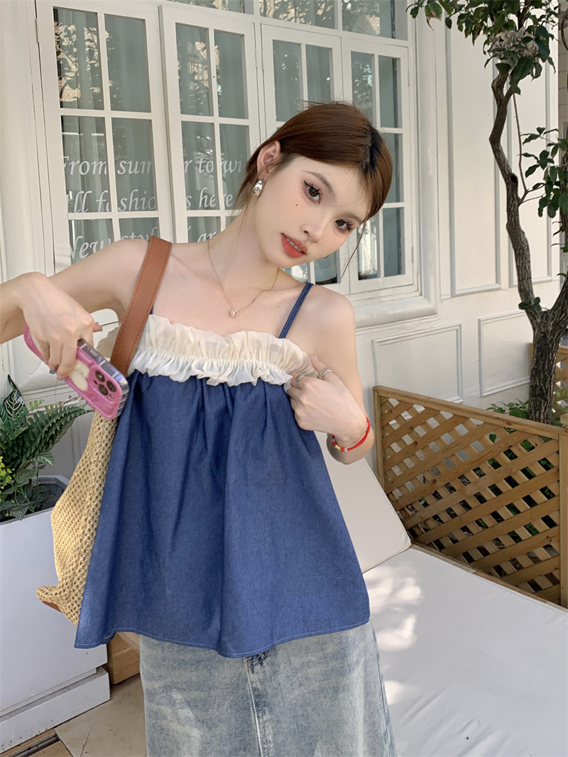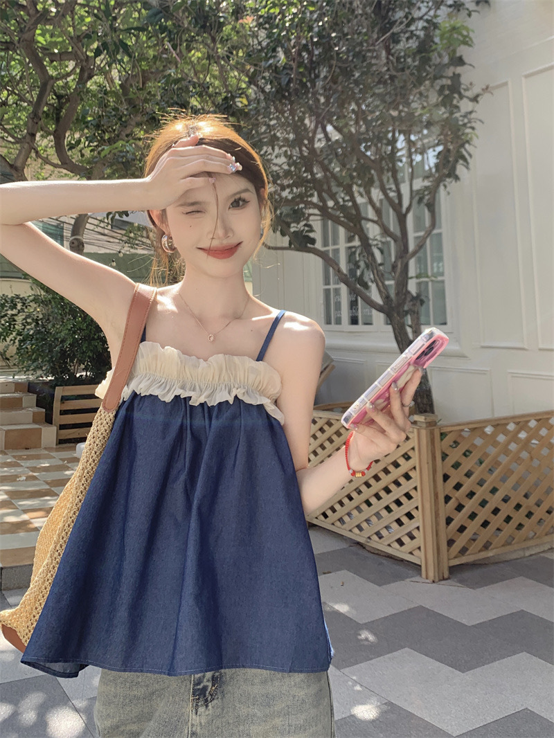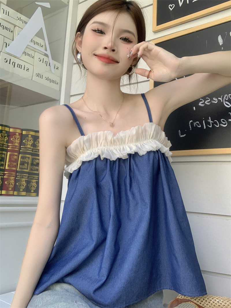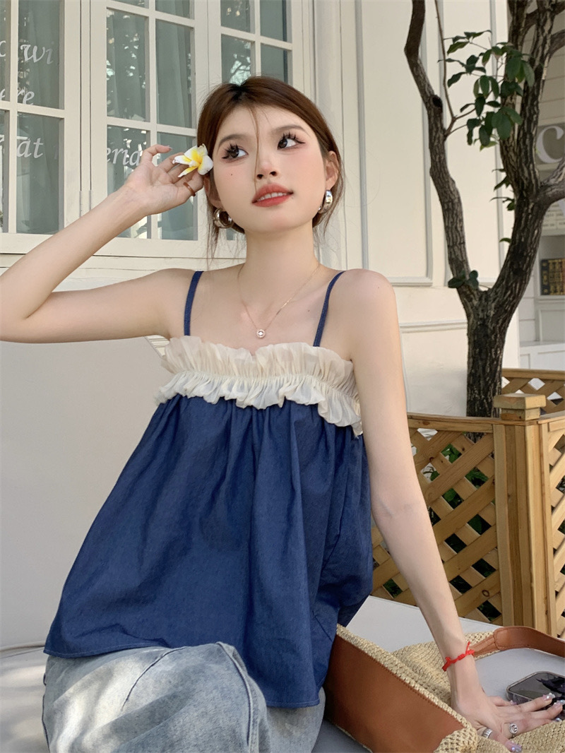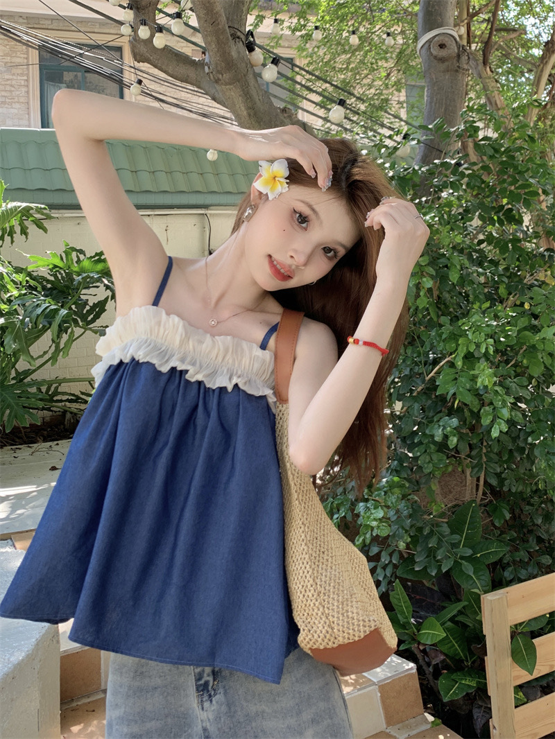 设计感甜辣妹荷叶边拼接吊带背心女夏季新款度假露肩宽松无袖上衣