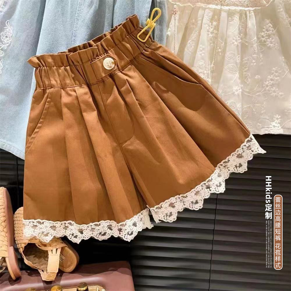 女童高腰木耳边一粒扣蕾丝包边百搭短裤热裤2025夏装新品短裤子