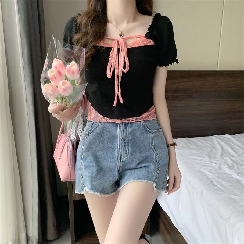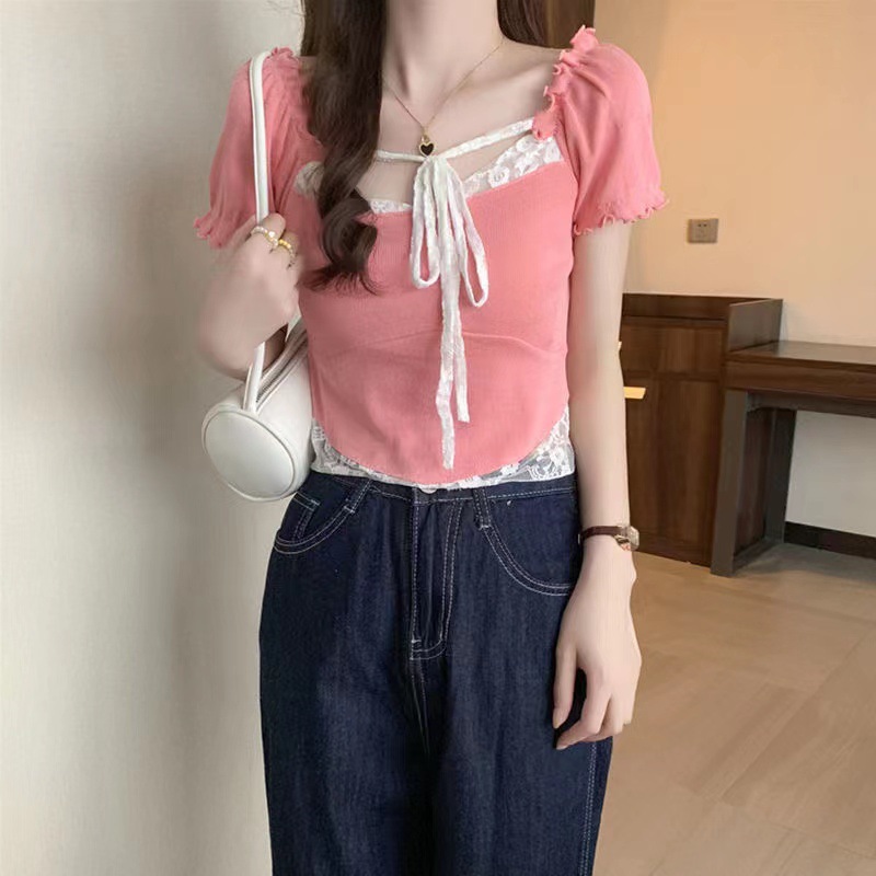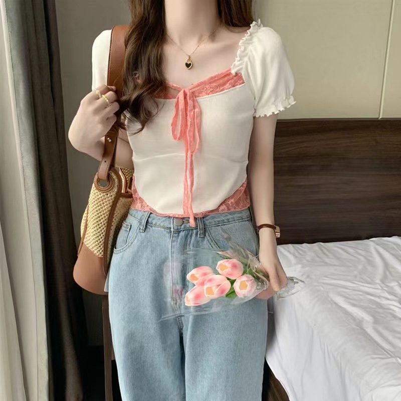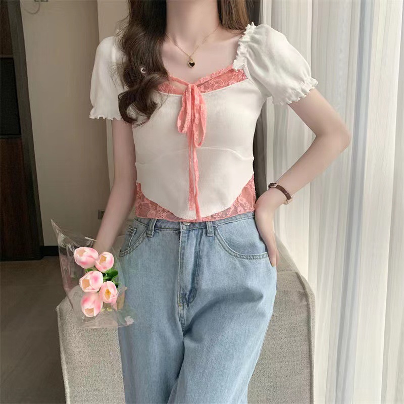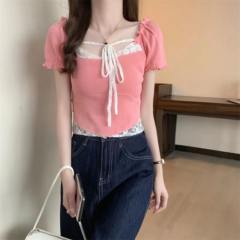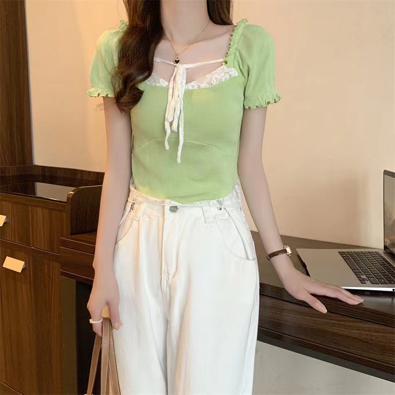 设计感小众套头方领短袖针织衫女夏季泡泡袖短款纯欲甜美可爱上衣