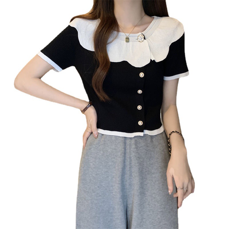 撞色花边领温柔短袖针织衫女夏季新款薄款修身显瘦短款上衣女小衫