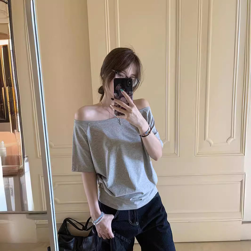 设计感露肩灰色短袖T恤女夏季宽松休闲斜肩黑色上衣