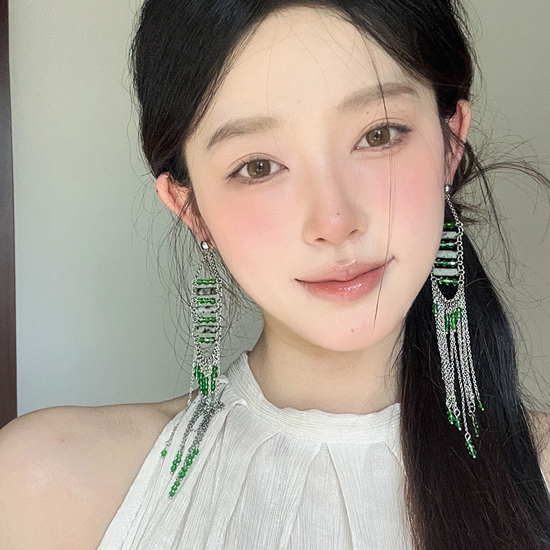 新中式独特绿色水晶流苏耳环小众设计感气质长款流苏耳坠国风耳饰