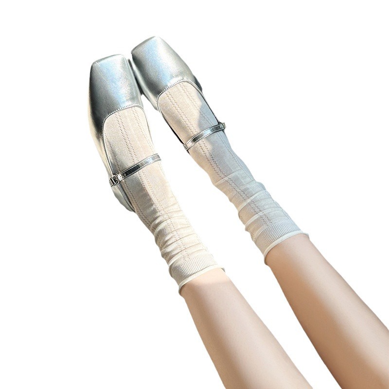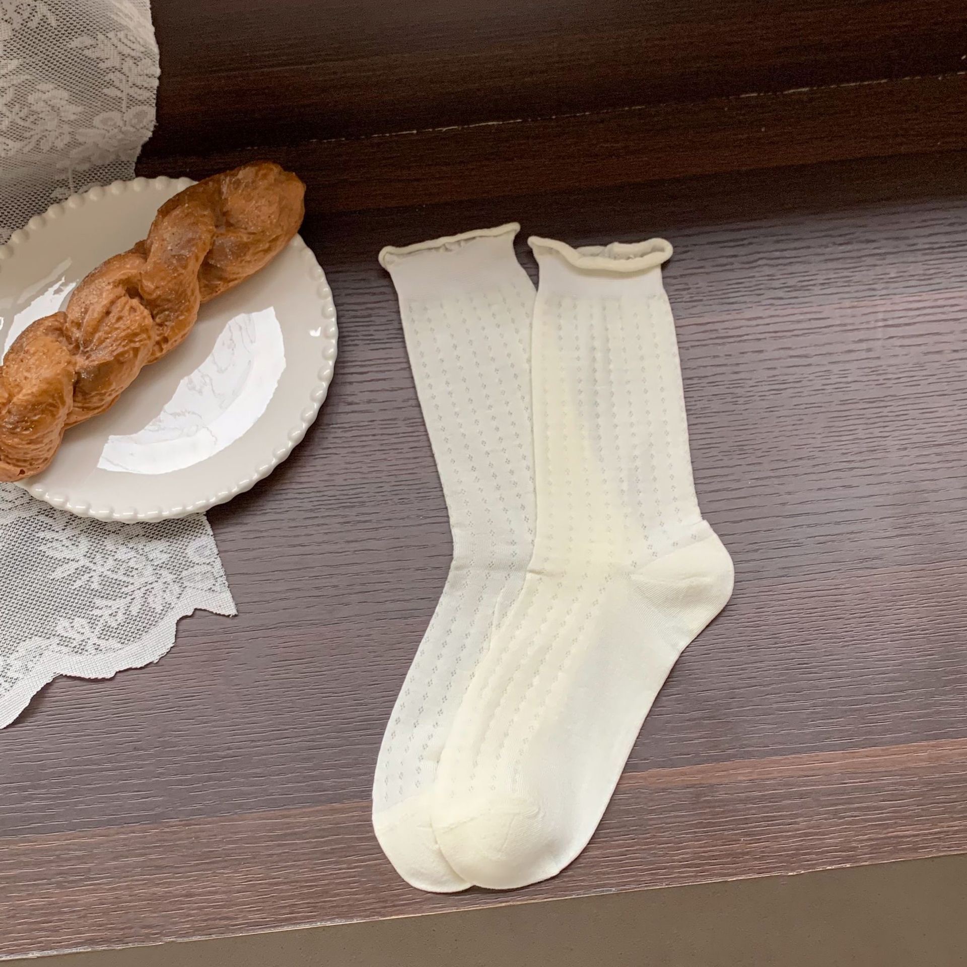 春夏新款卷边玻璃丝镂空少女可爱透气日系堆堆袜ins纯色中筒袜女