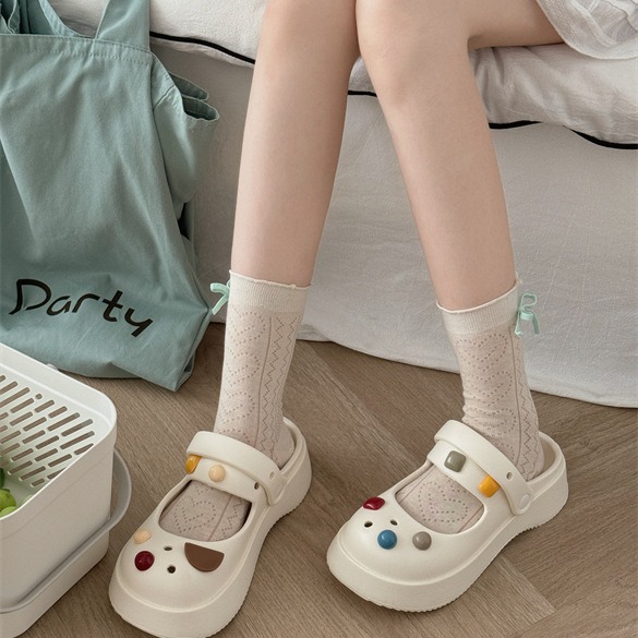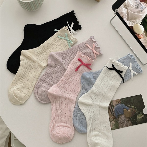 日系甜美百搭夏季新品高弹棉木耳边爱心镂空马卡龙色蝴蝶结薄短袜
