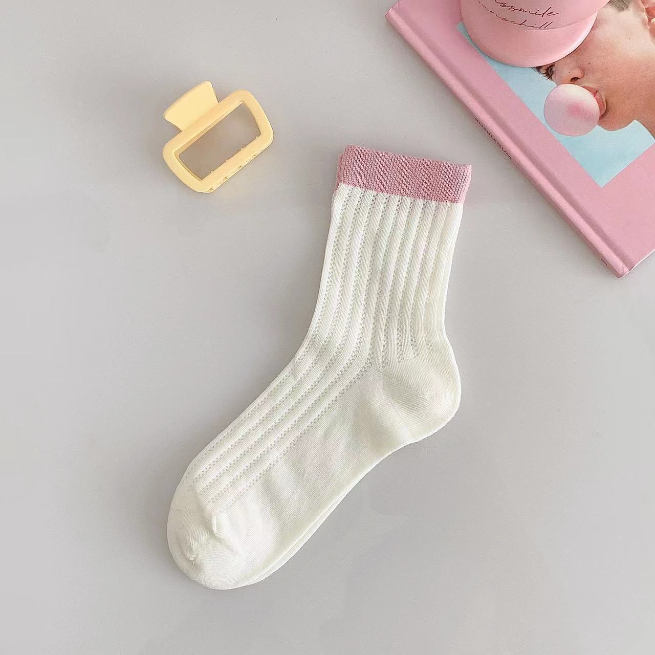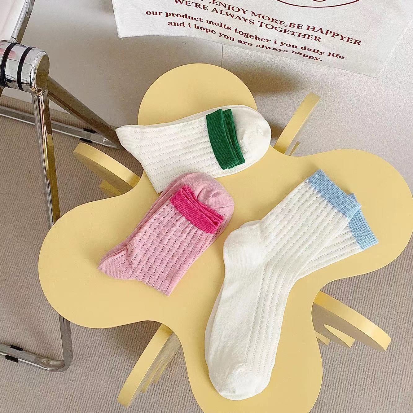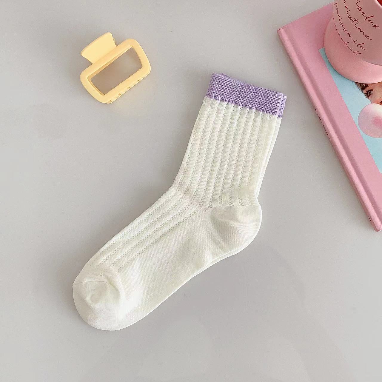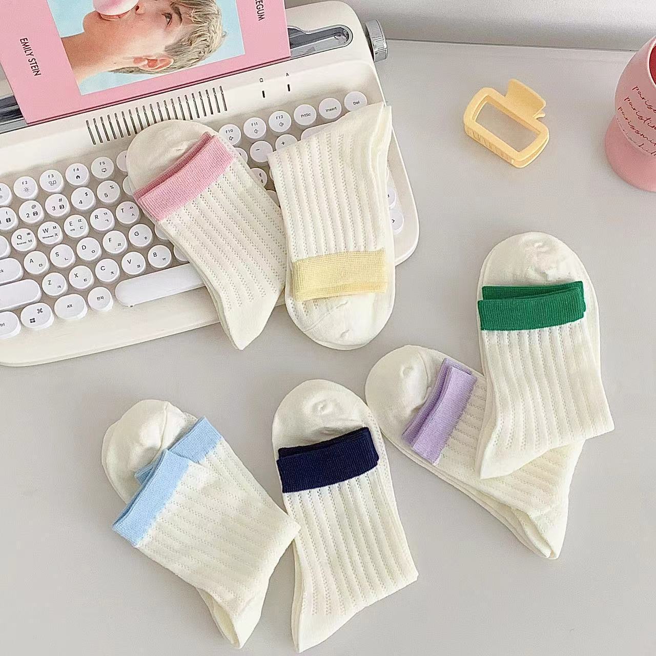 袜子女夏季薄款网眼透气中筒袜ins潮糖果色镂空简约拼色休闲棉袜