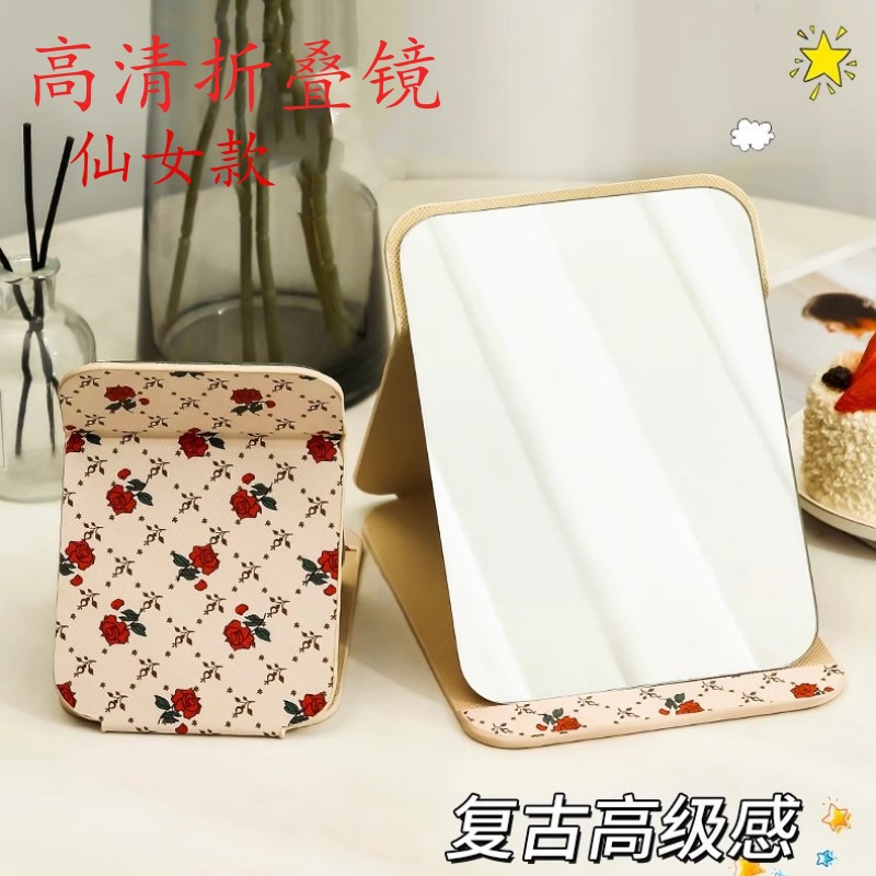 便携随身PU复古折叠镜卧室宿舍桌面台式化妆镜高清梳妆镜子化妆镜