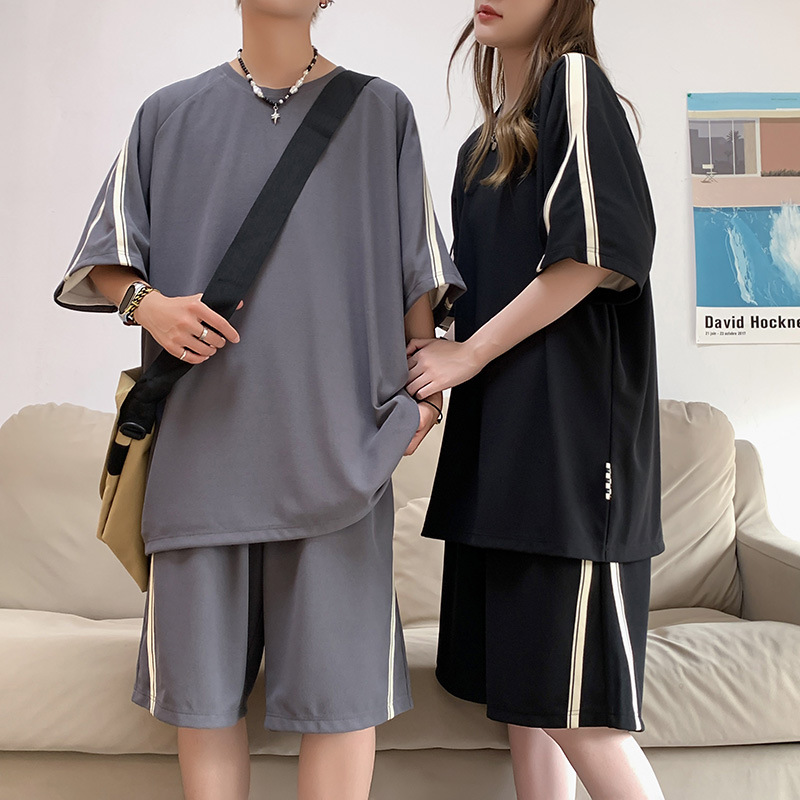 优质条纹休闲运动套装男夏季港风复古潮牌青少年短袖T恤短裤一套