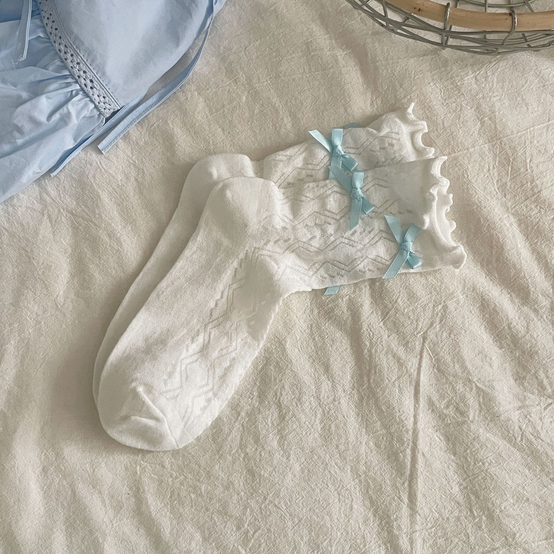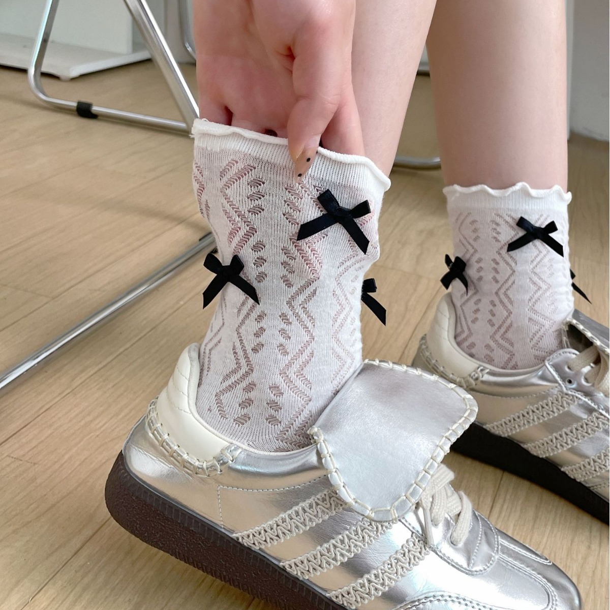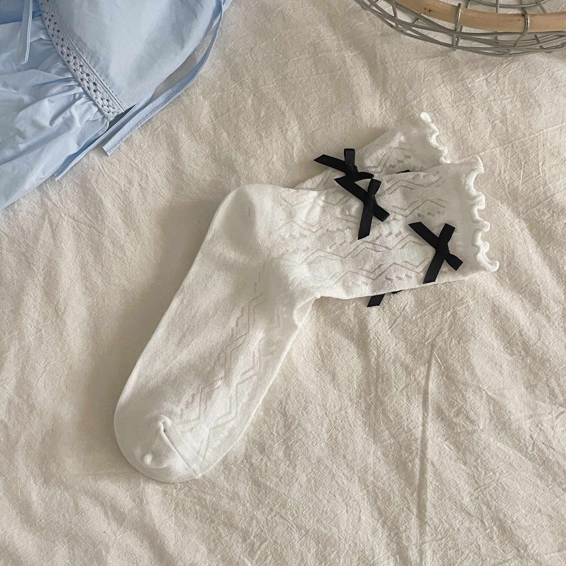 芭蕾风花边薄款网眼纯色蝴蝶结中筒堆堆袜子女透气吸汗竖波纹棉袜