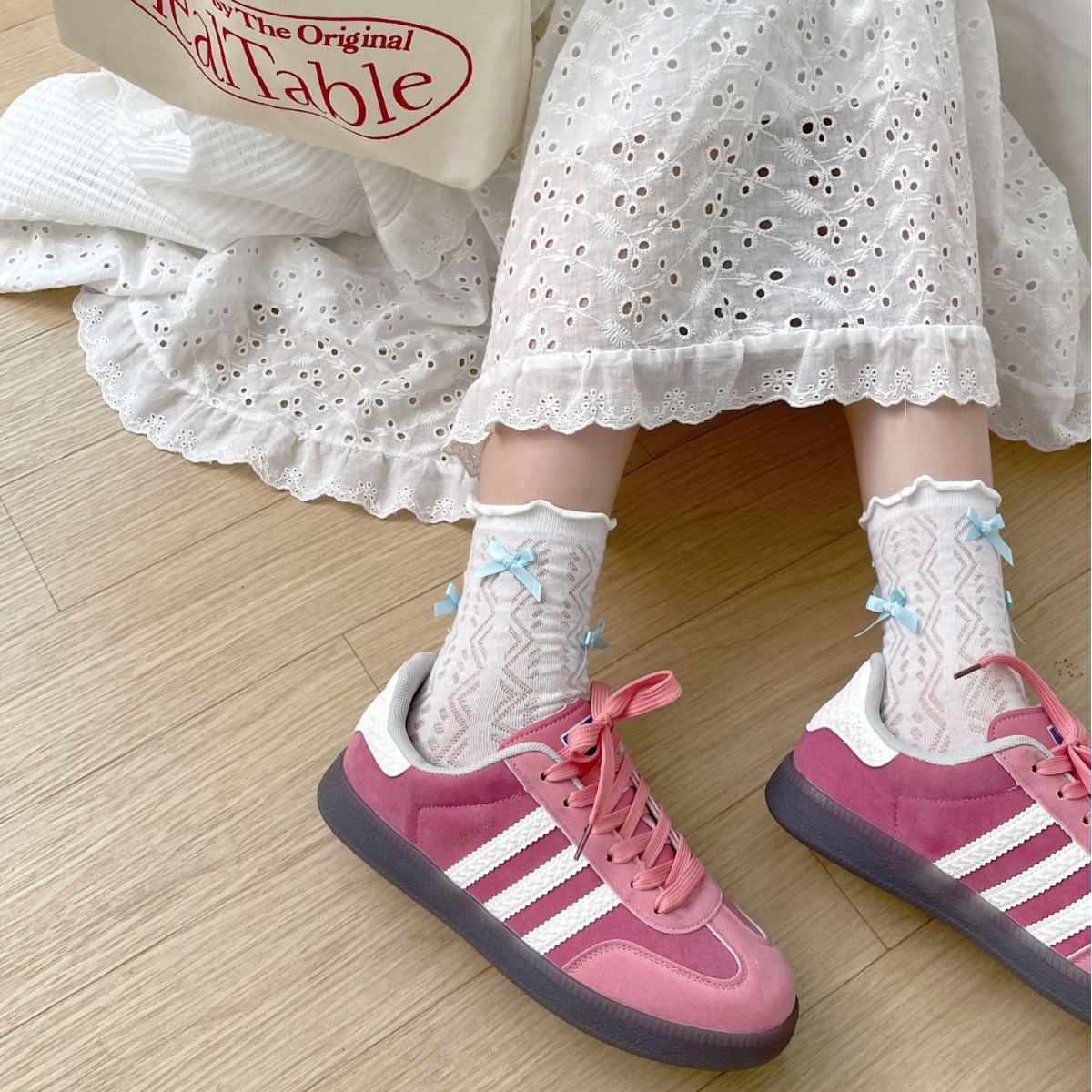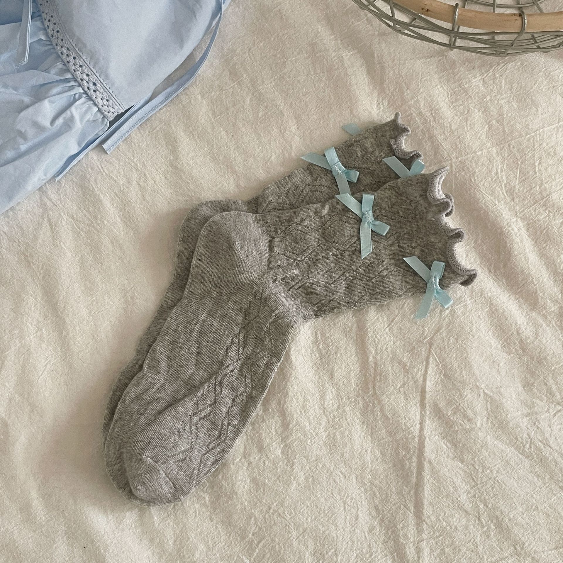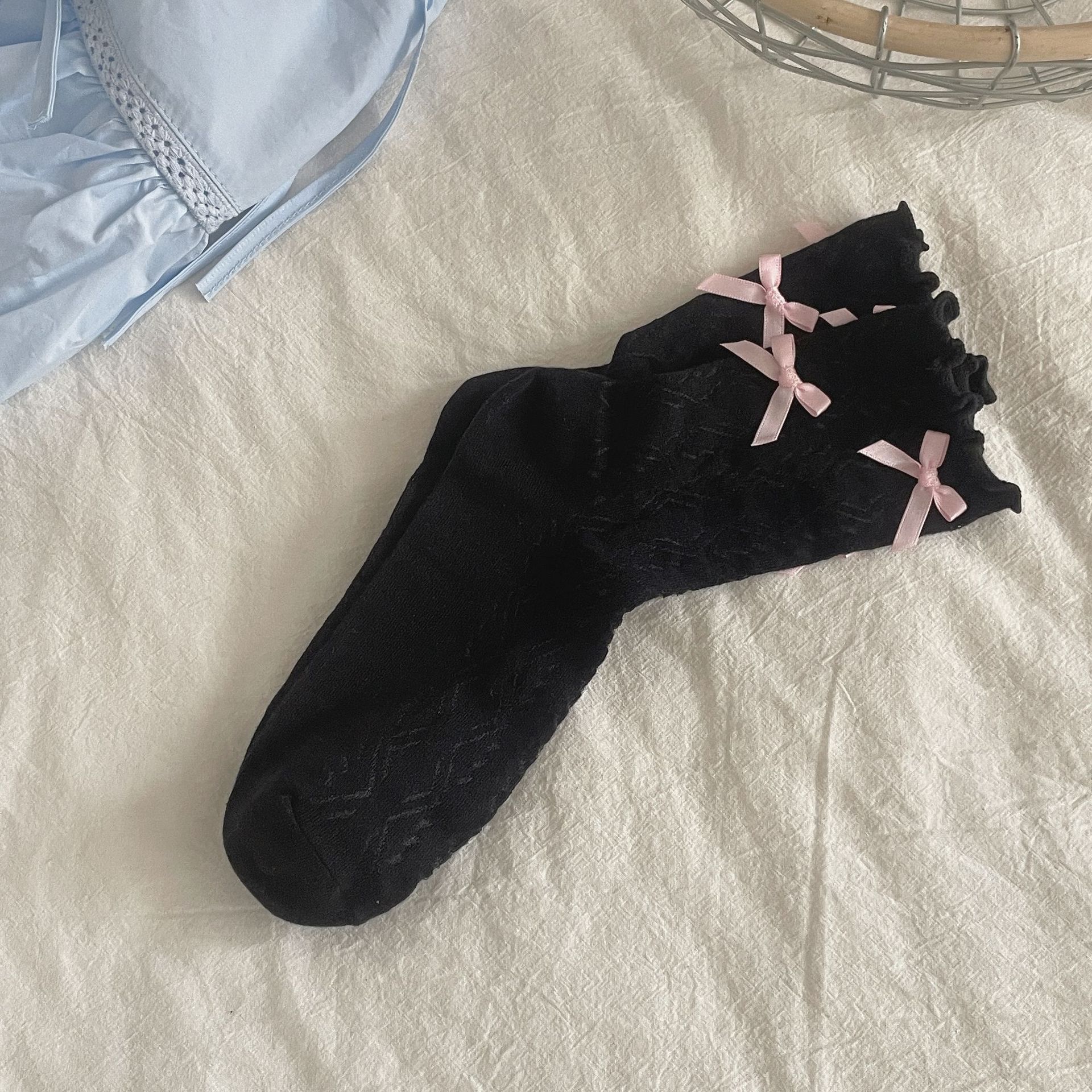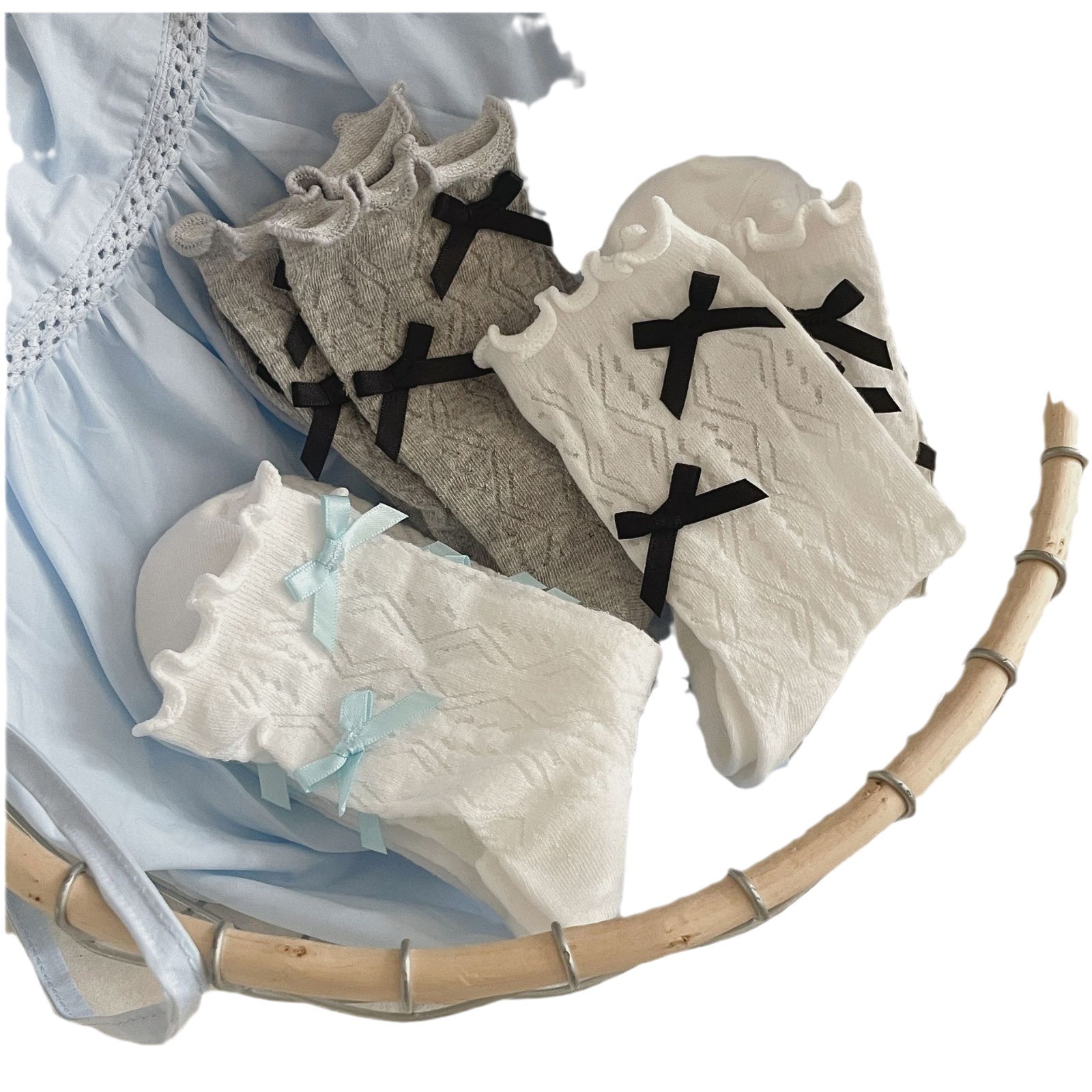 芭蕾风花边薄款网眼纯色蝴蝶结中筒堆堆袜子女透气吸汗竖波纹棉袜