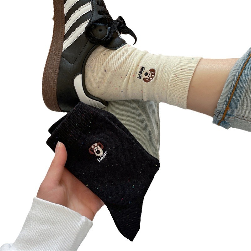 ins韩系点子纱刺绣狗狗可爱袜子女百搭卡通中筒纯色学院风堆堆袜