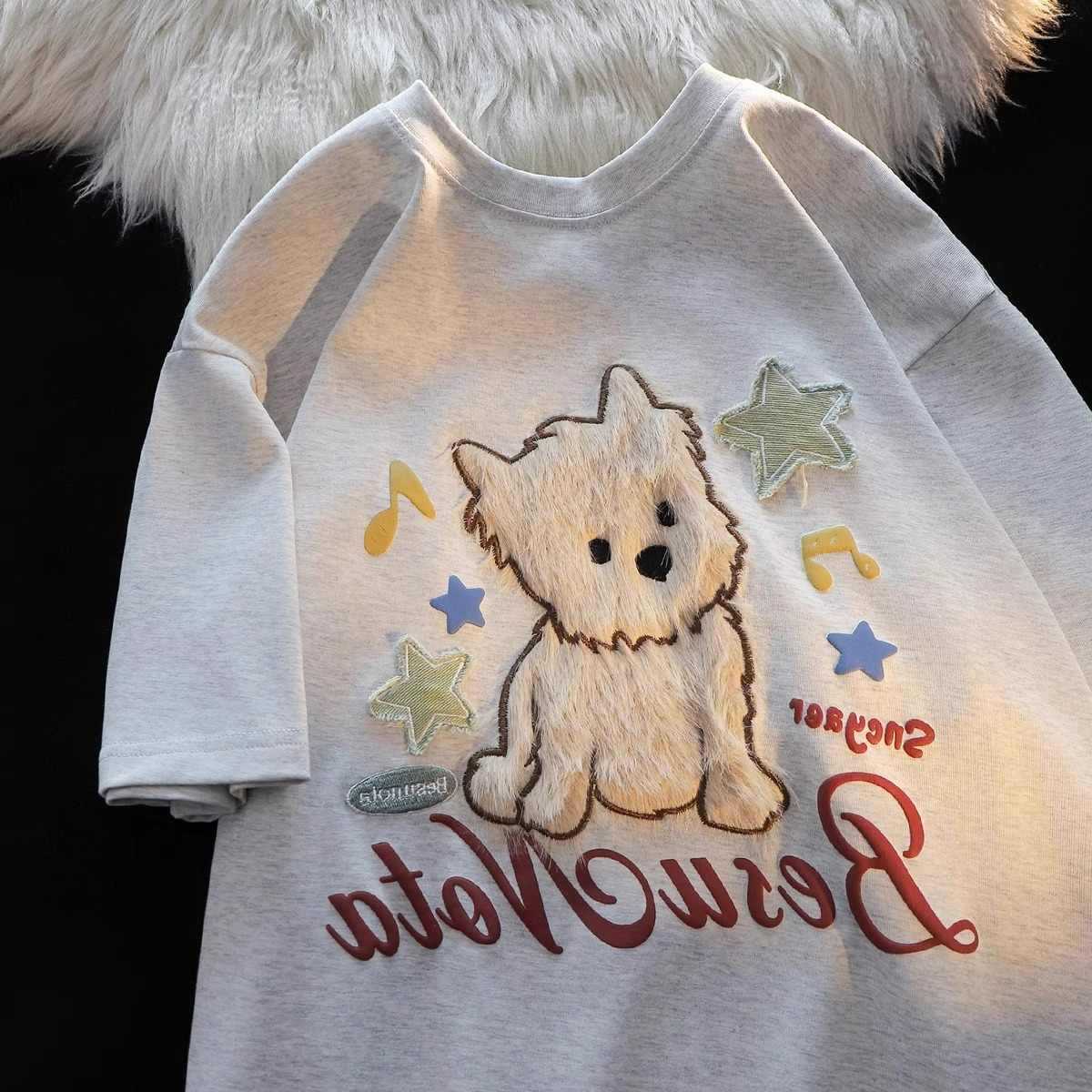 毛绒刺绣小狗纯棉短袖t恤男女夏季宽松韩系可爱慵懒风ins半袖上衣
