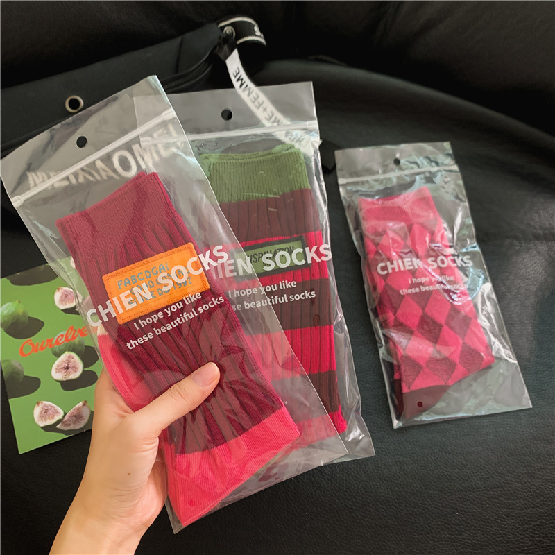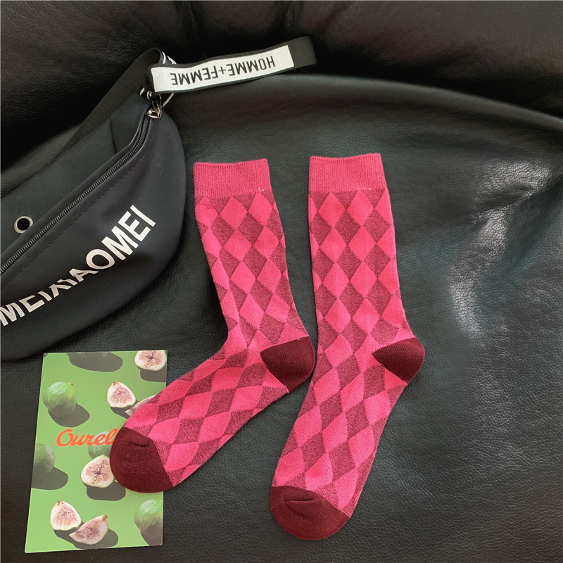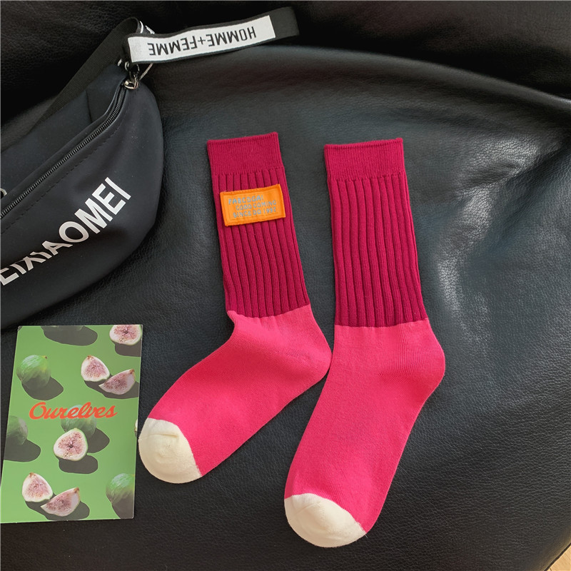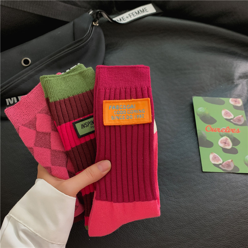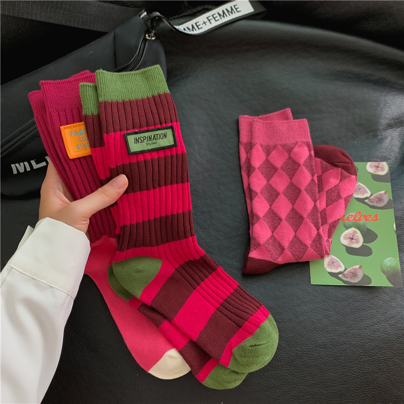 袜子女布标条纹拼色菱形女中筒袜ins潮双针玫红色系女袜子堆堆袜