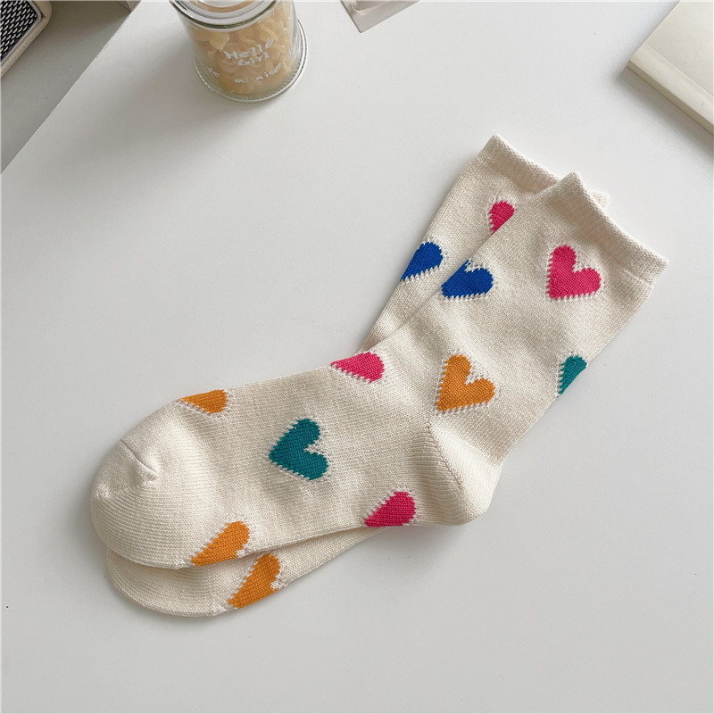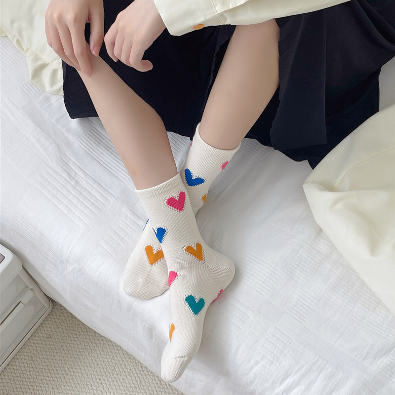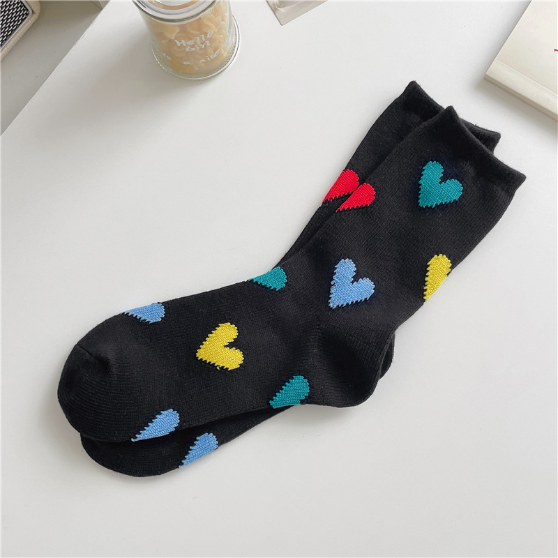 新品粗线彩色爱心袜子女ins风韩版中筒黑白棉袜多巴胺彩色运动袜