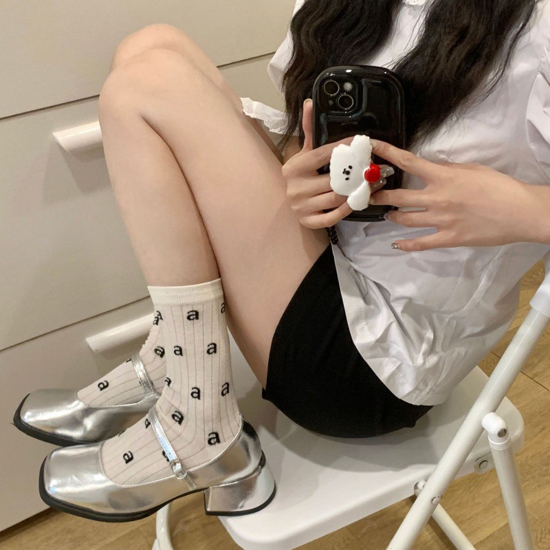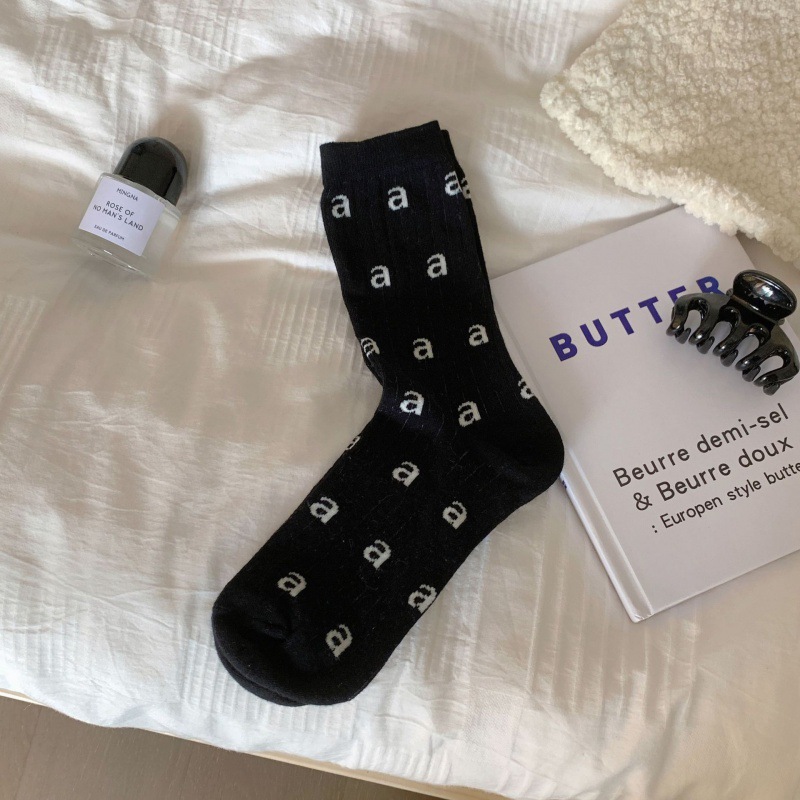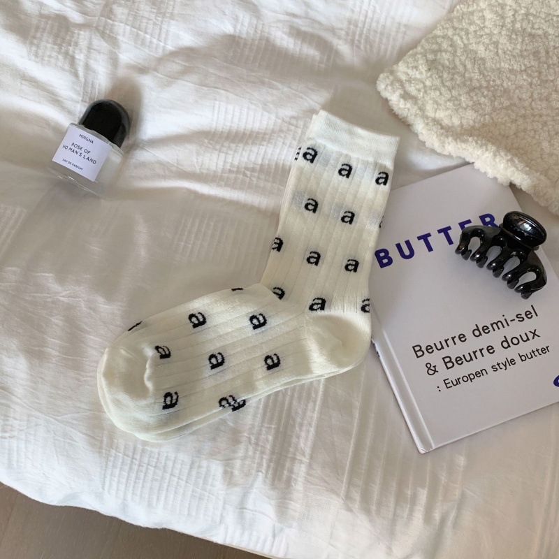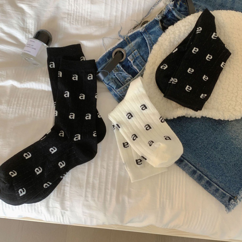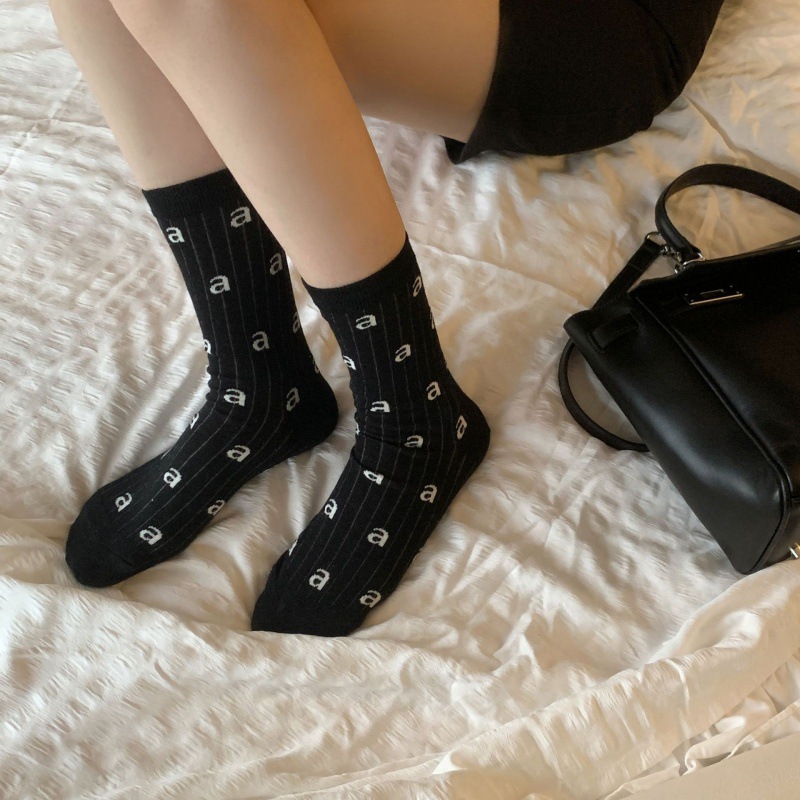 袜子女新品韩国潮袜ins黑白网眼薄透气英文a字母中筒袜纯棉女袜