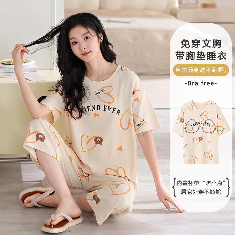 带胸垫睡衣女士夏季纯棉短袖七分裤家居服薄款休闲全棉可外穿套装