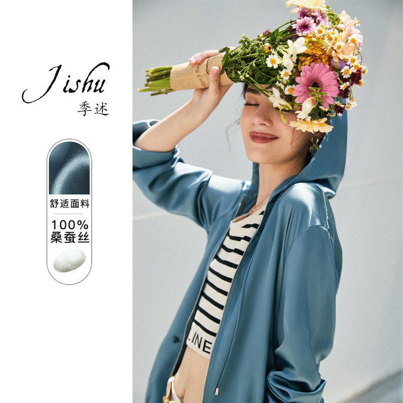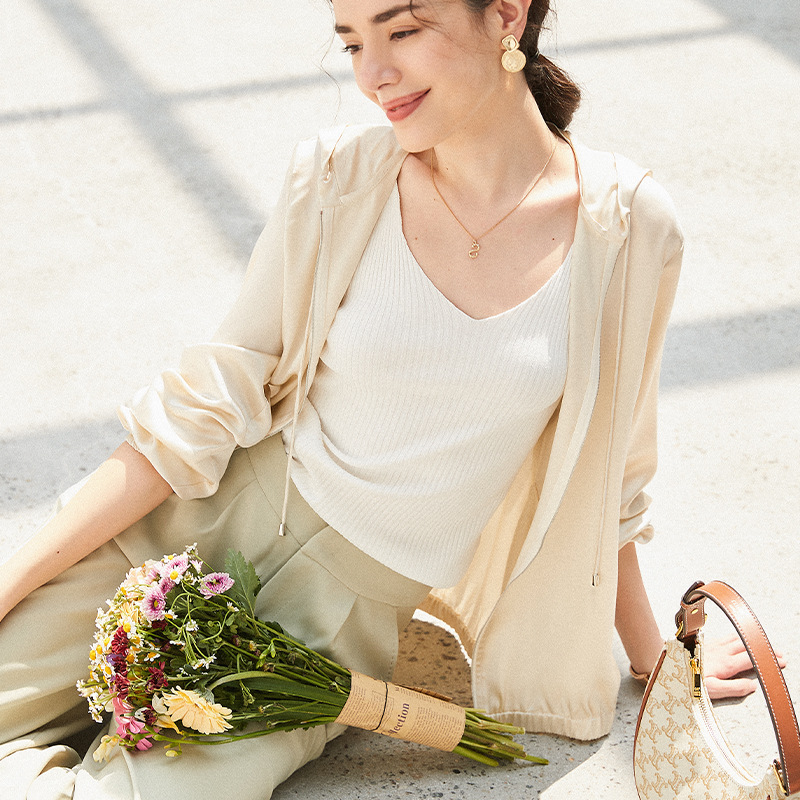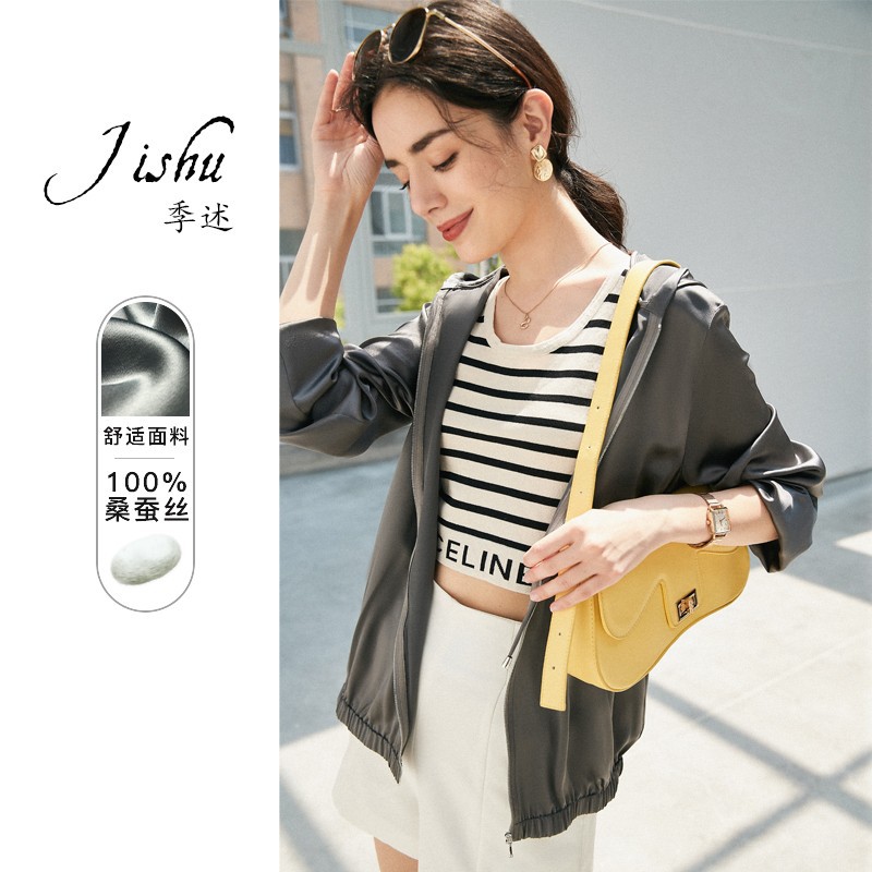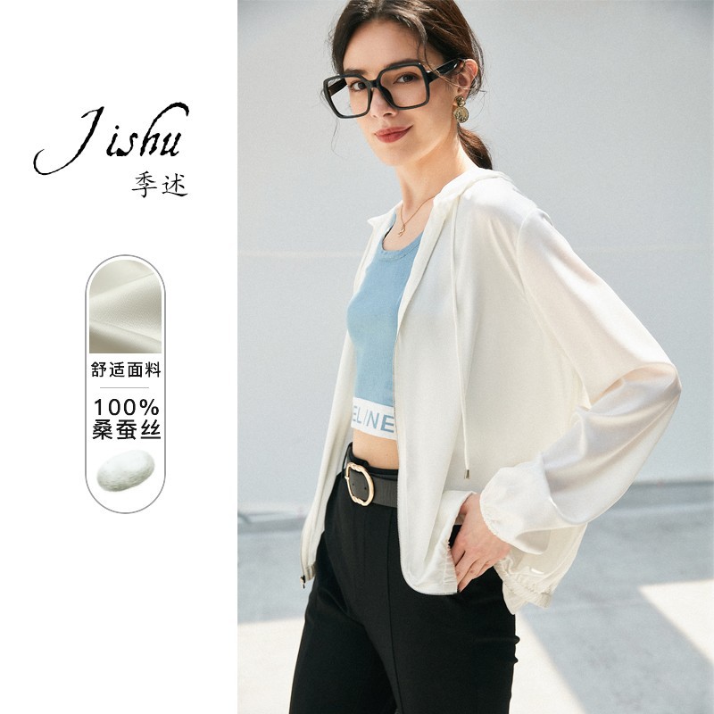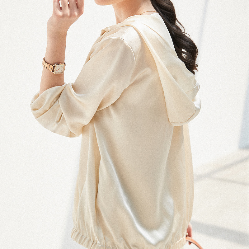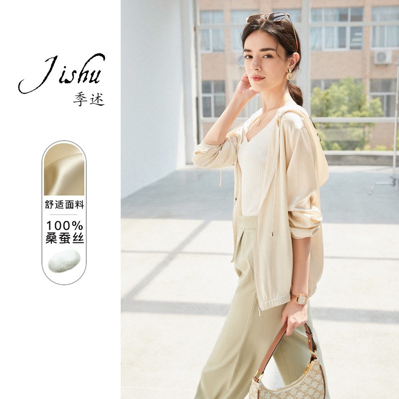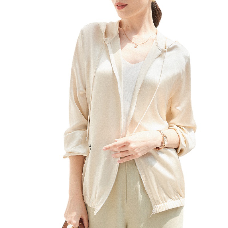 真丝短外套女新款春夏桑蚕丝开衫连帽薄款防晒衣时尚纯色上衣