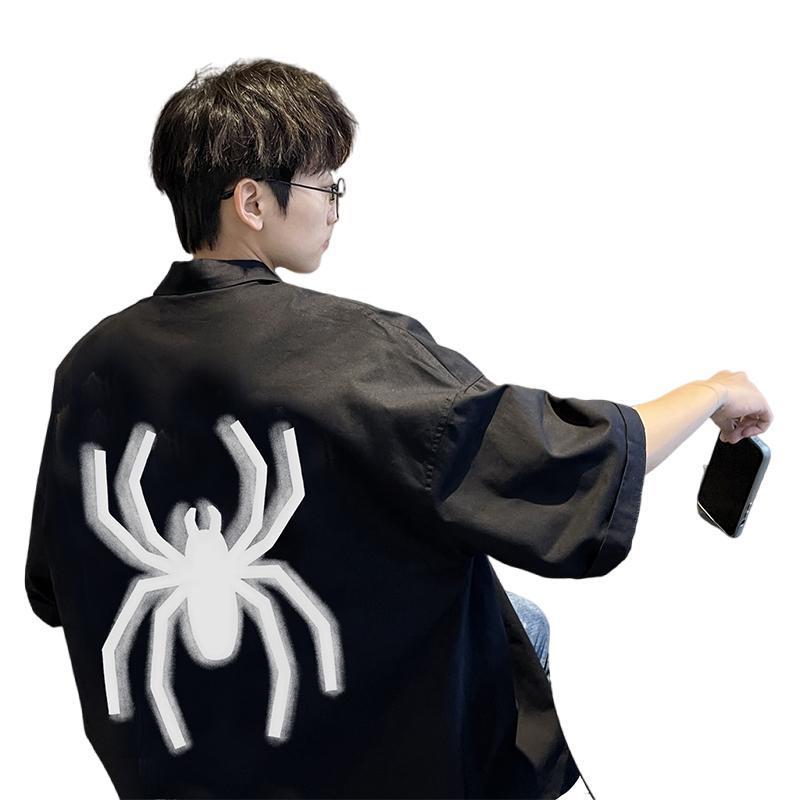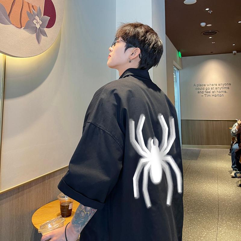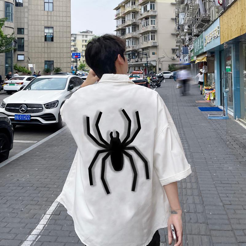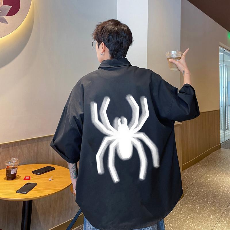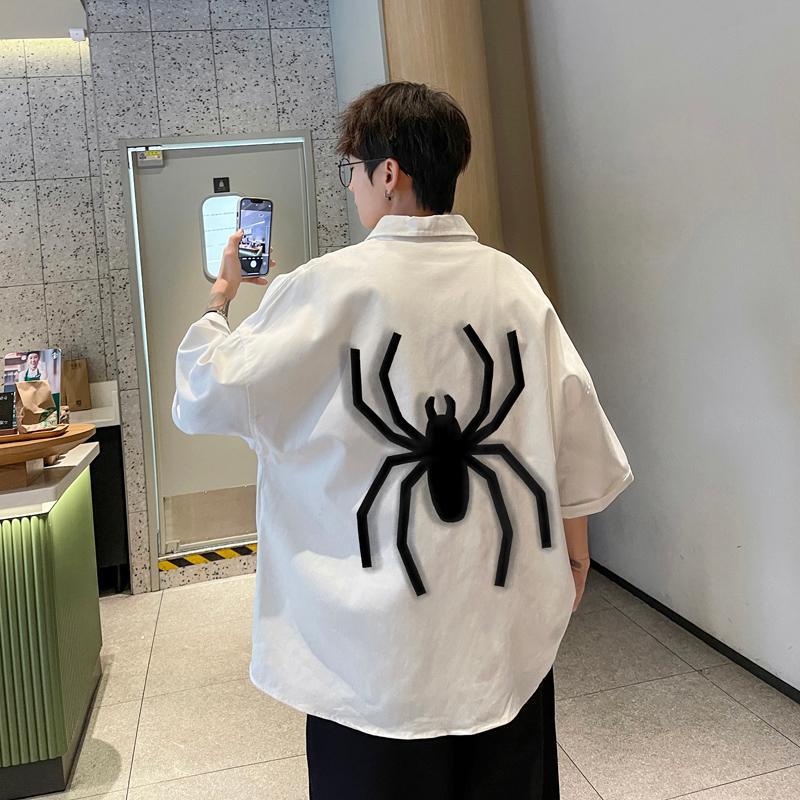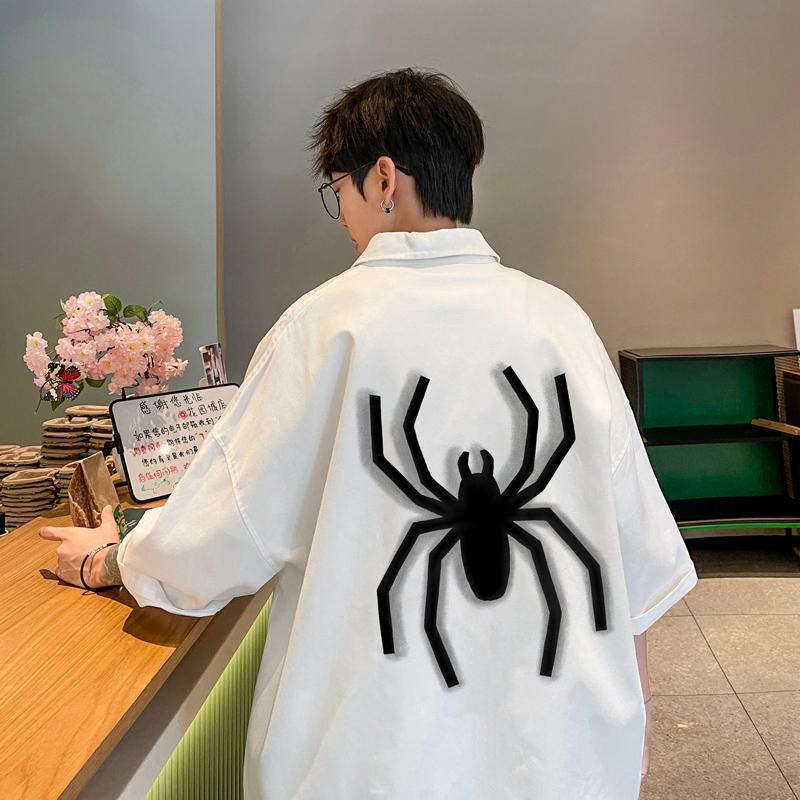 蜘蛛印花半袖衬衫男生春夏季薄款宽松百搭潮牌休闲青少年外穿衬衣
