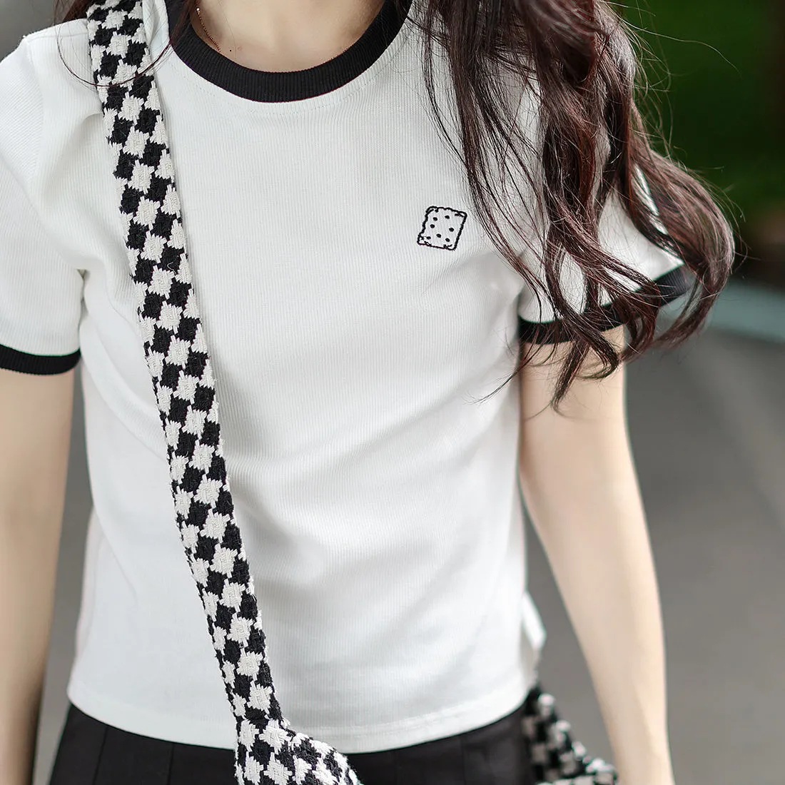 撞色边小饼干刺绣冰丝螺纹短袖T恤女ins夏季宽松休闲正肩显瘦上衣