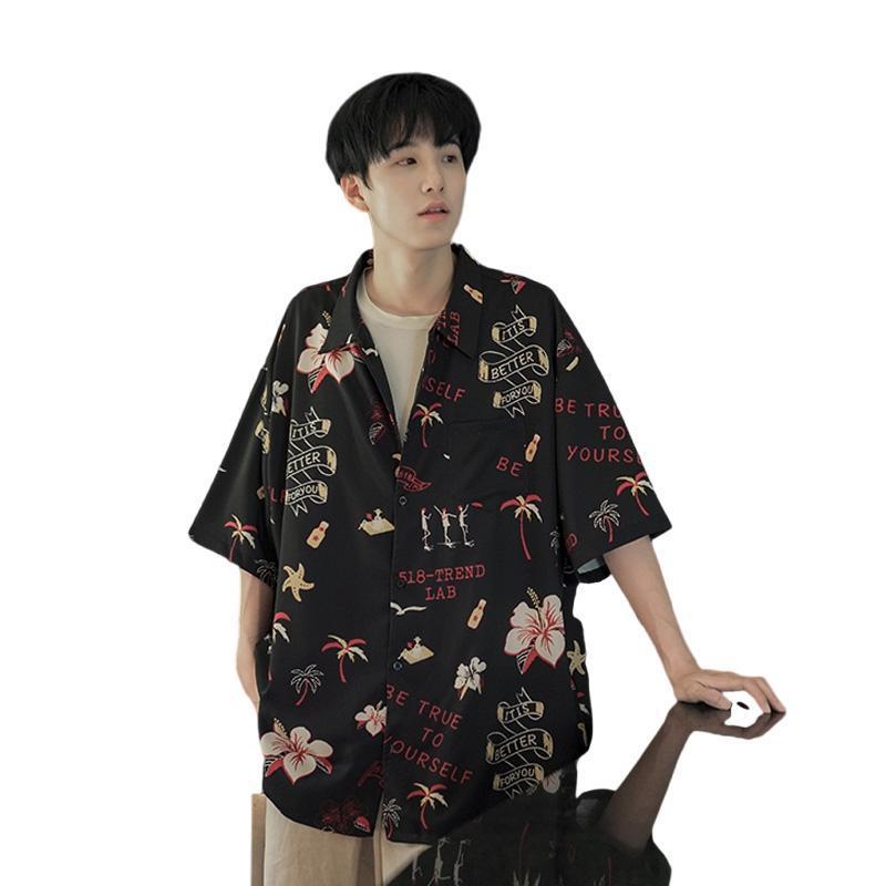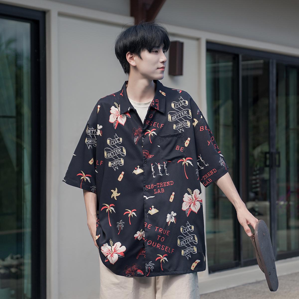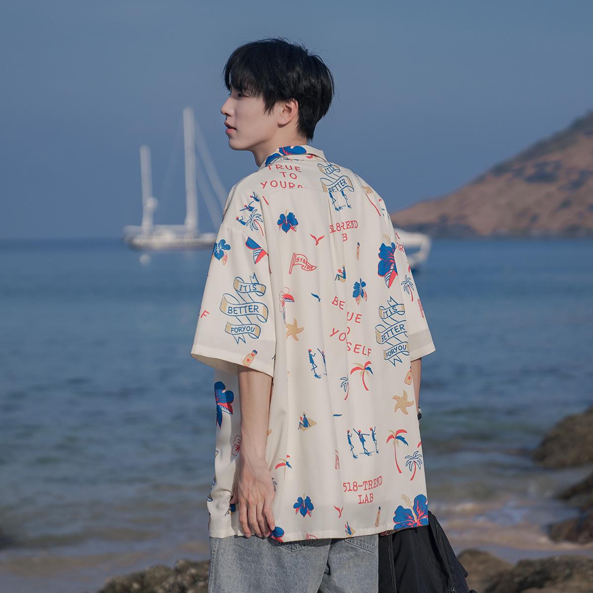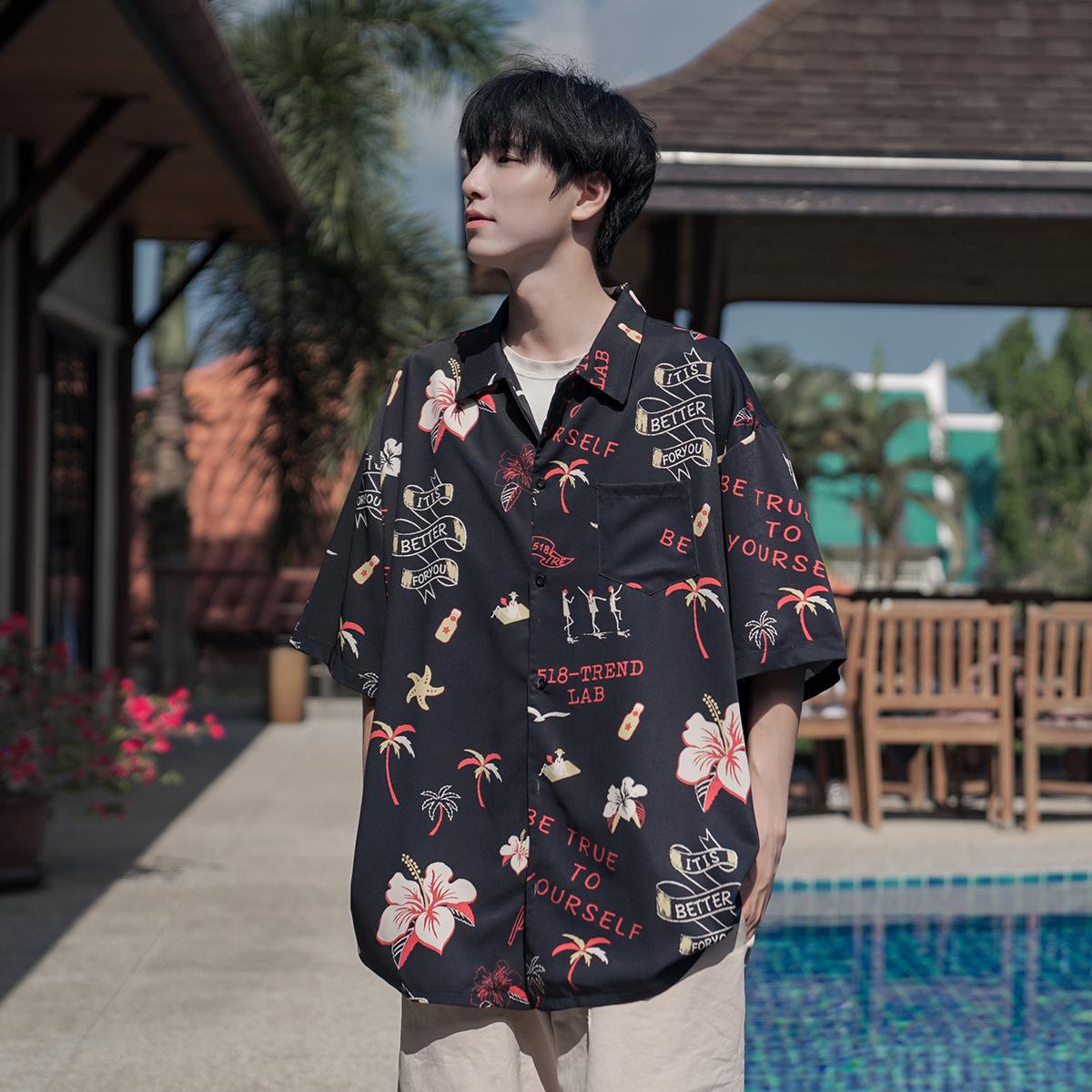 花衬衫男生夏季新款港风海边痞帅高级感短袖度假沙滩夏威夷风衬衣