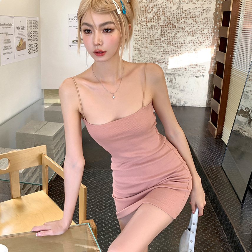 实拍夏装新款ins裸粉法式吊带连衣裙女纯欲风紧身辣妹包臀裙
