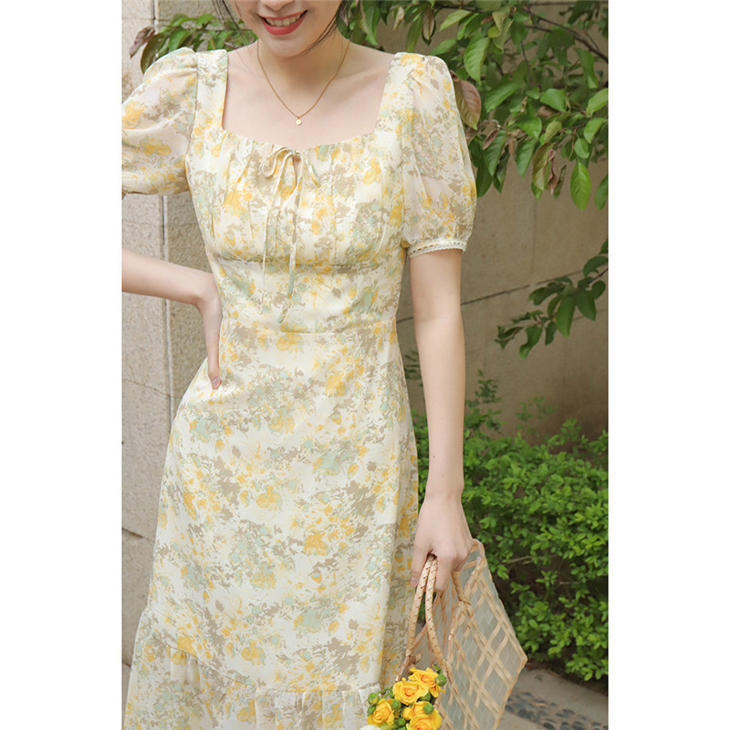 新款法式超仙女森系中长款黄色泡泡袖碎花方领连衣裙子夏季