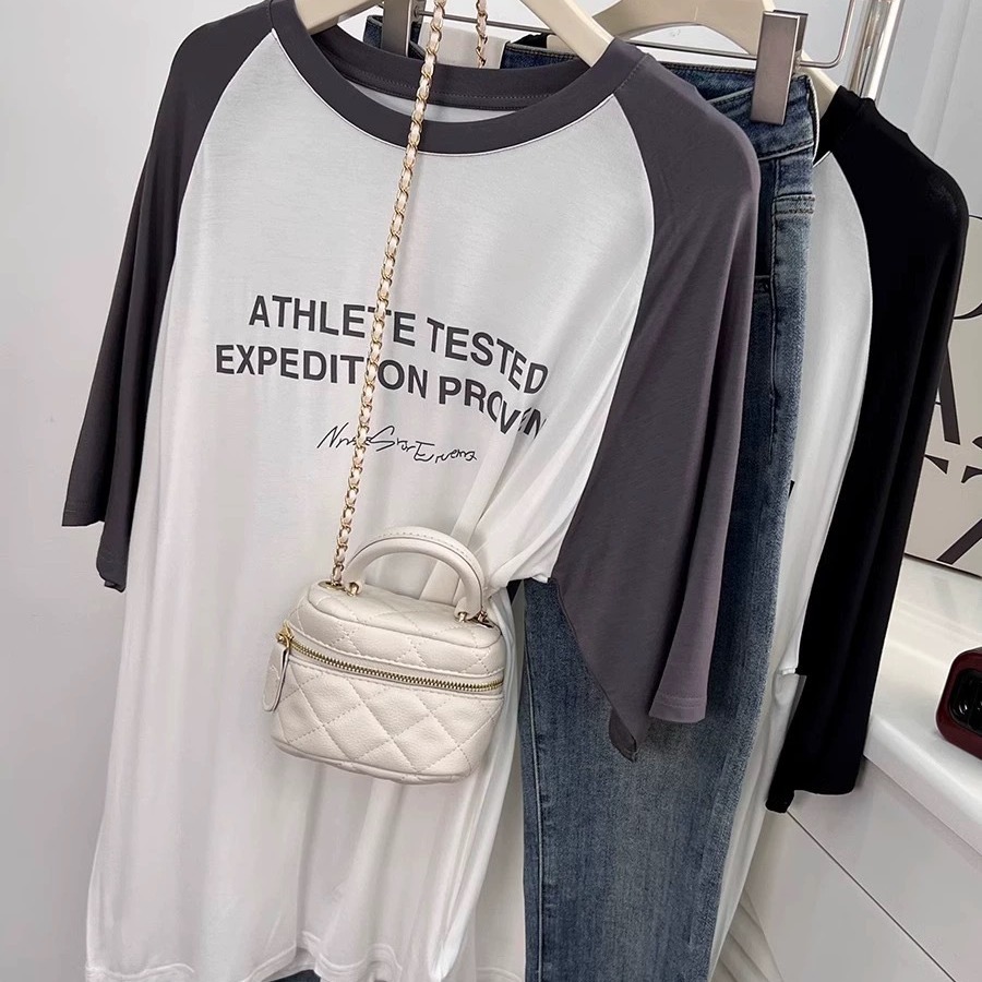 清凉舒适莫代尔拼色短袖t恤女夏季薄款宽松慵懒风中长款半袖上衣