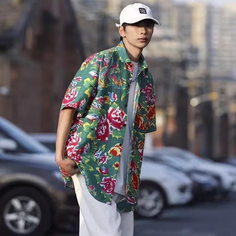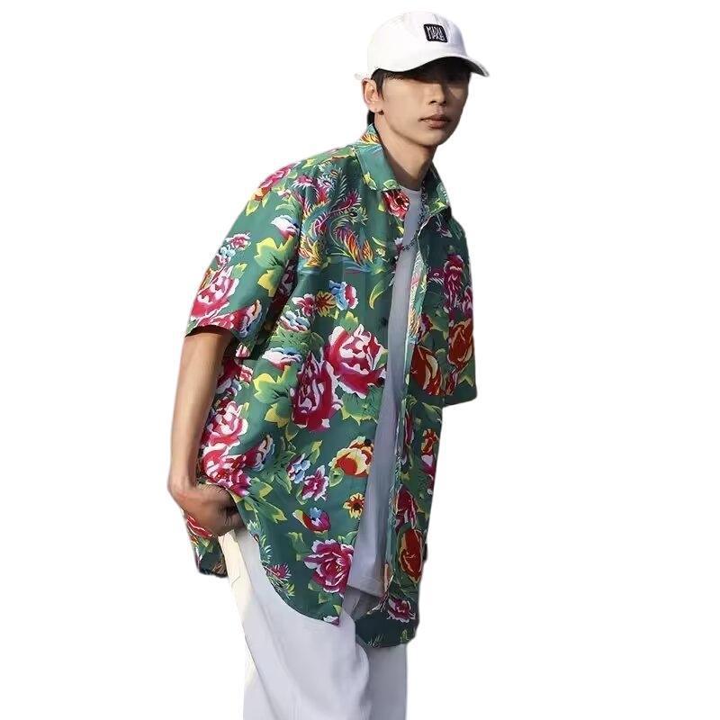 新中式东北大花衬衣男生夏季薄款短袖上衣流行别致超好看小众衬衫