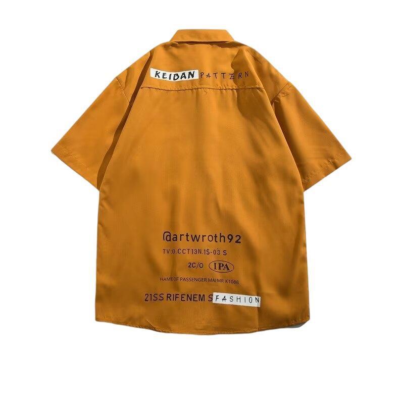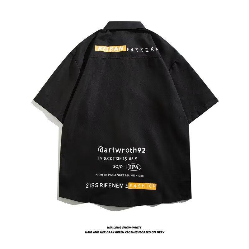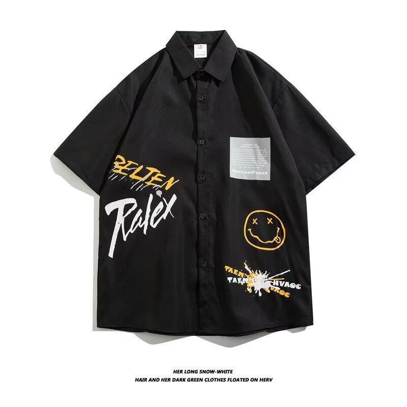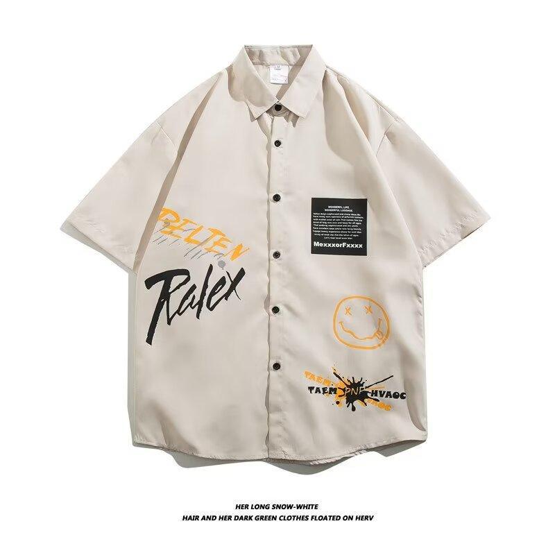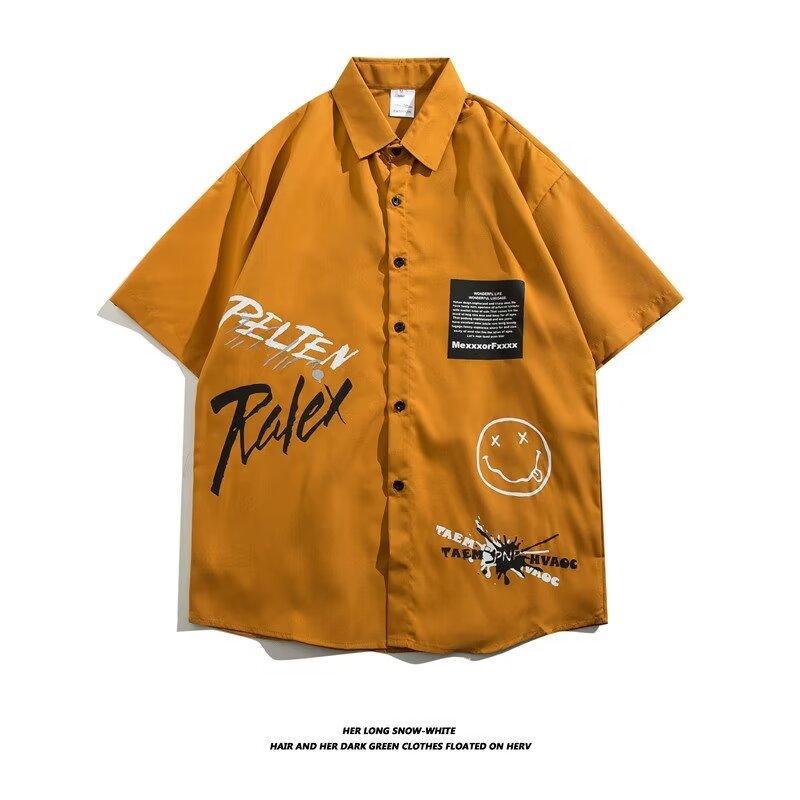 春夏季日系休闲风衬衫外套男生短袖小众设计感潮牌笑脸字母上衣服