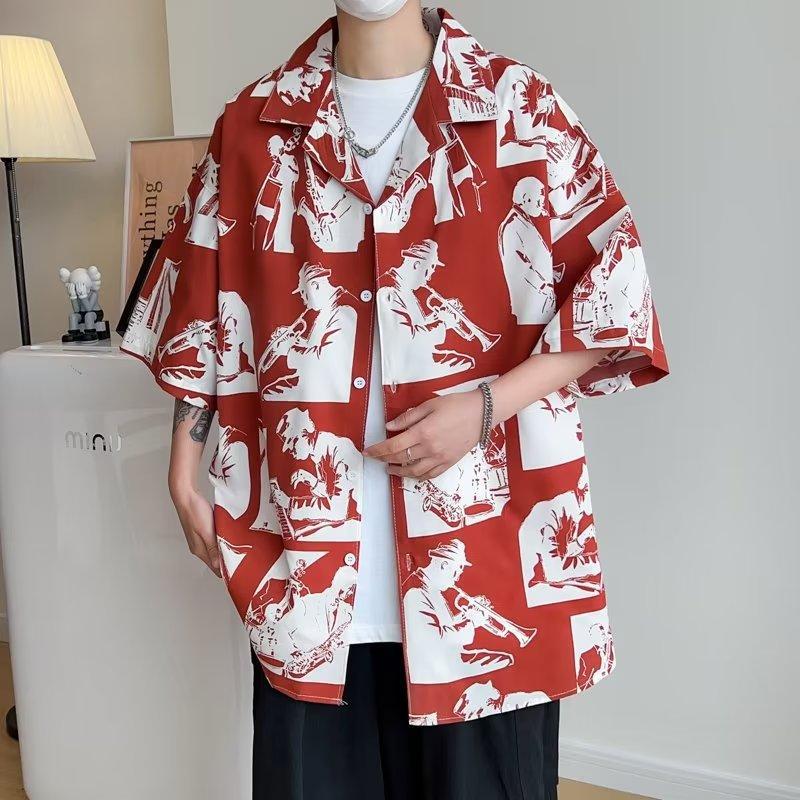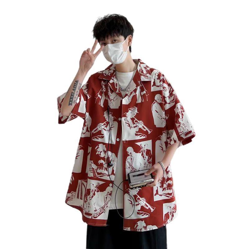 美式复古短袖衬衫男生夏季薄款潮牌风痞帅炸街宽松休闲港风花衬衣