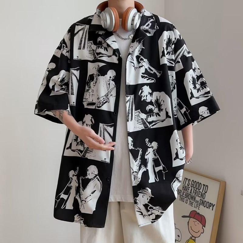 时尚气质水墨印花衬衫男夏季宽松短袖复古港风碎花设计感上衣男装