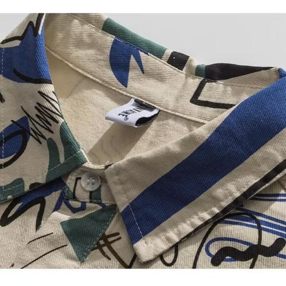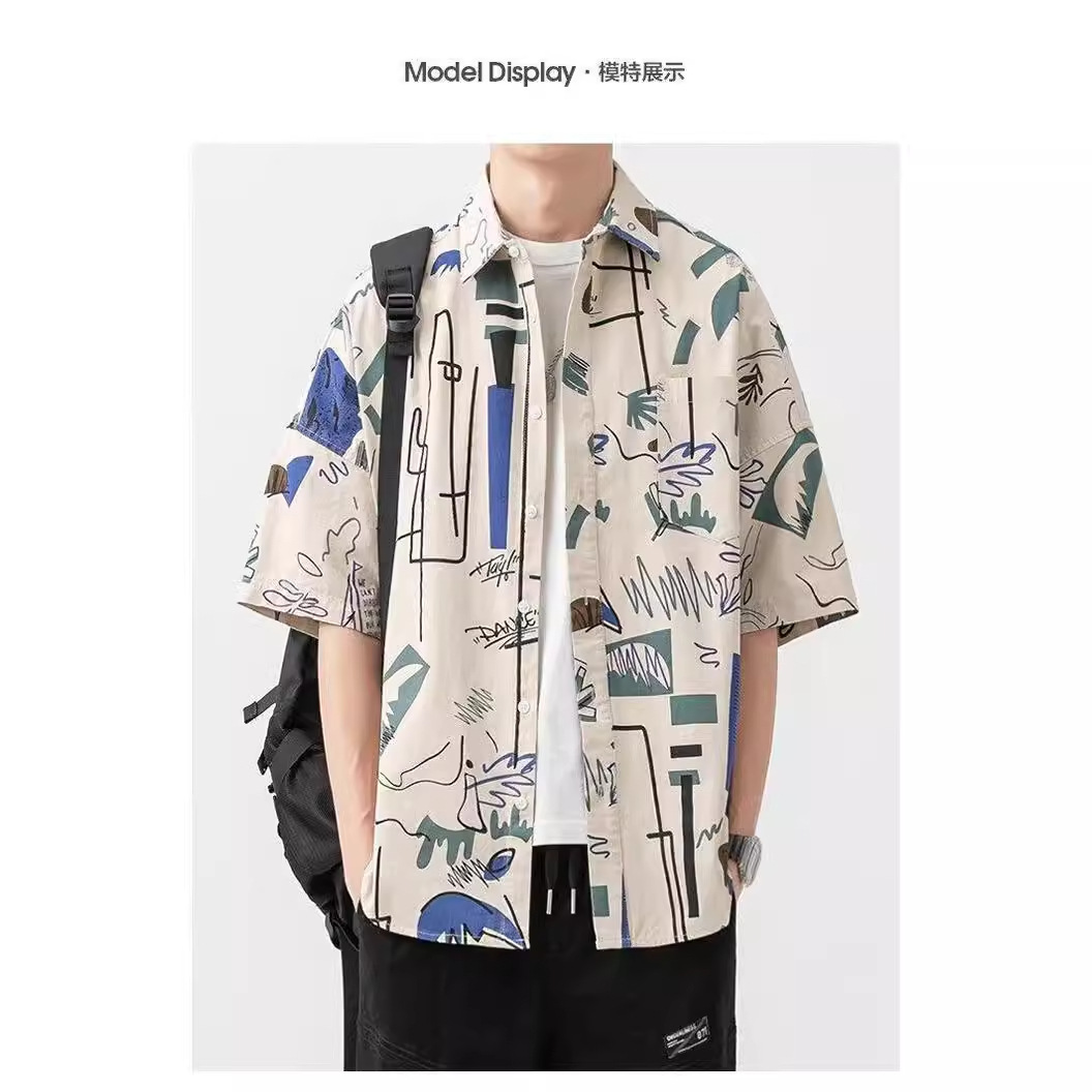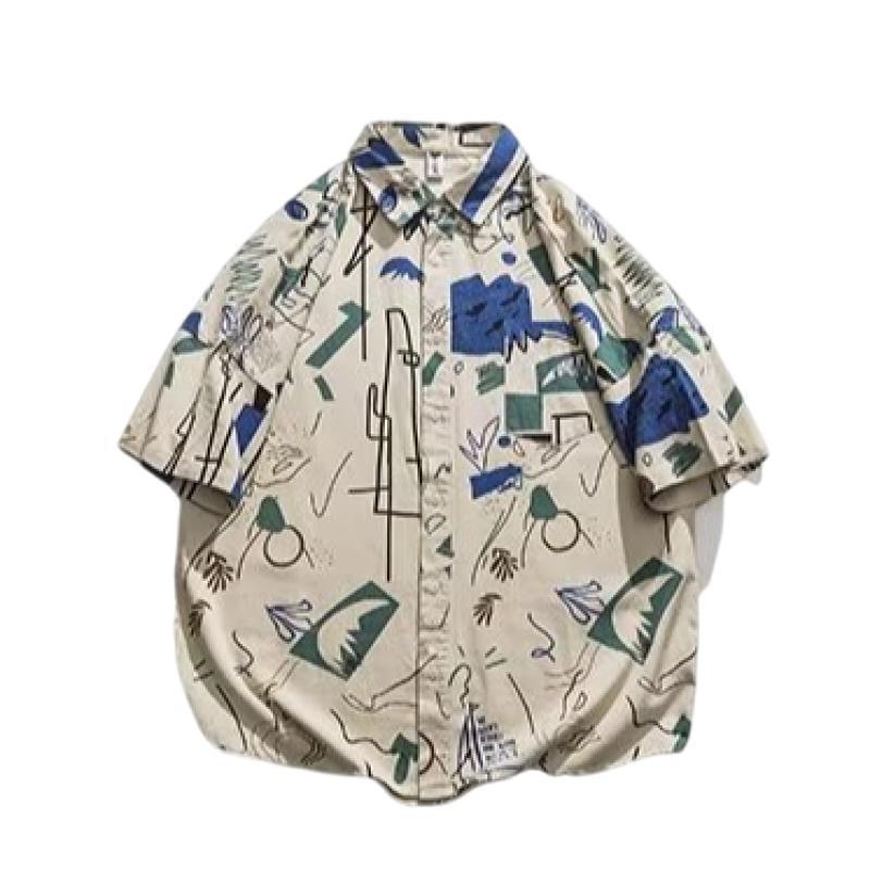 夏季薄款复古满印点缀短袖衬衫男生潮牌街头宽松情侣休闲百搭衬衣